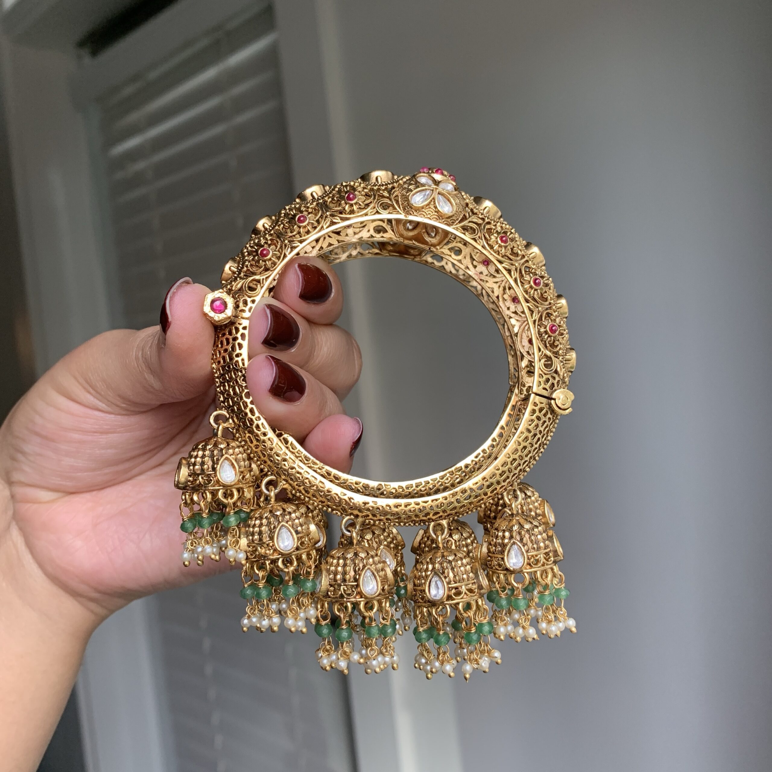 Embellished with stunning red and green stones, these antique gold karre reflect a traditional and opulent design. The delicate jhumkas hanging at the bottom provide a timeless charm.