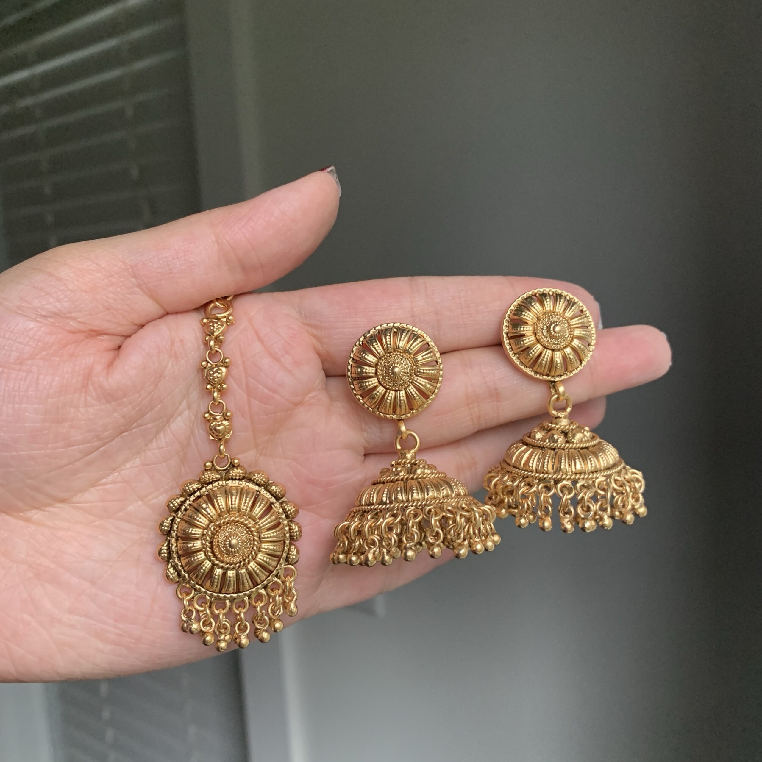 This antique gold waterfall set features intricate circular motifs and cascading beadwork, creating a stunningly elegant look. Paired with matching earrings and tikka, it adds a regal touch with a timeless appeal.