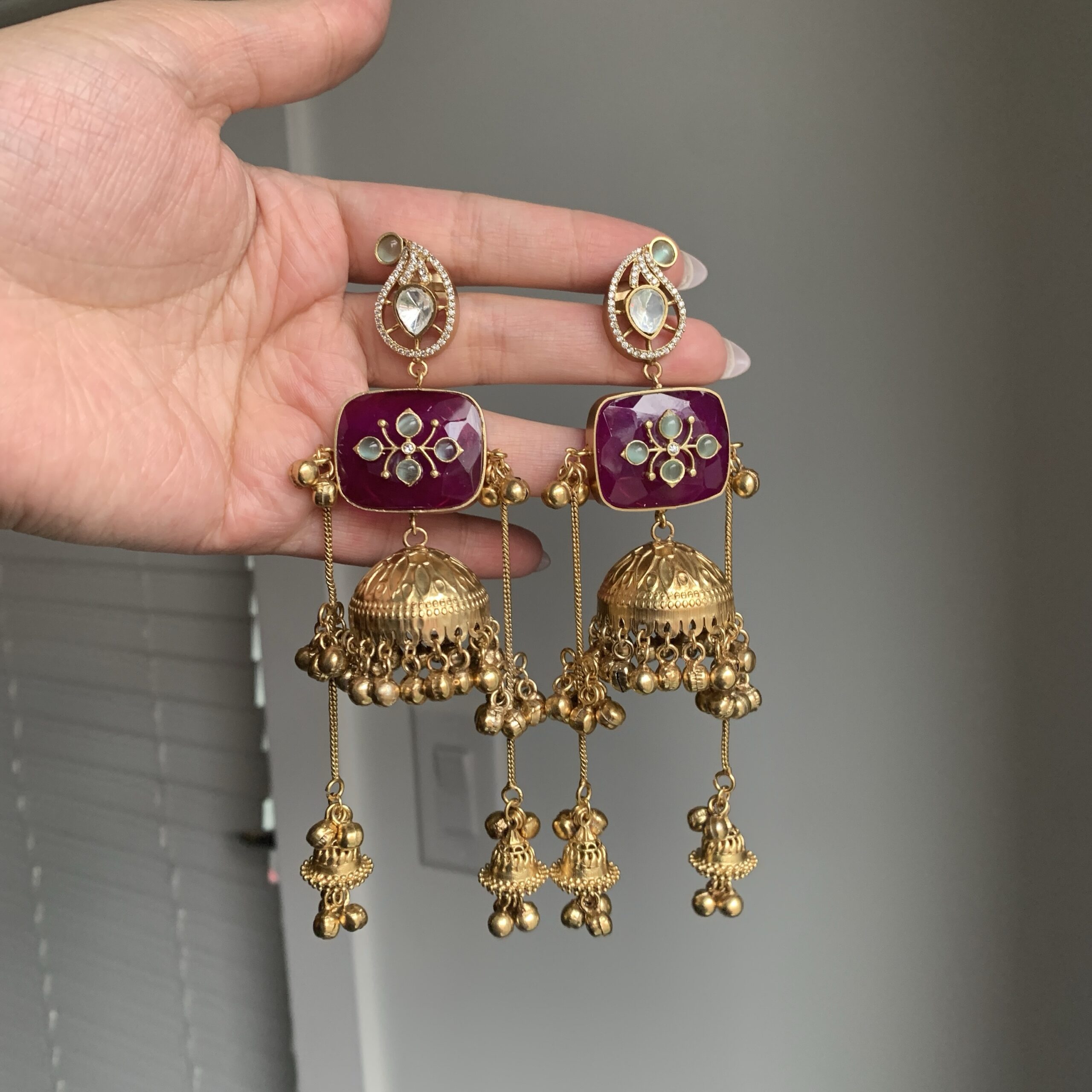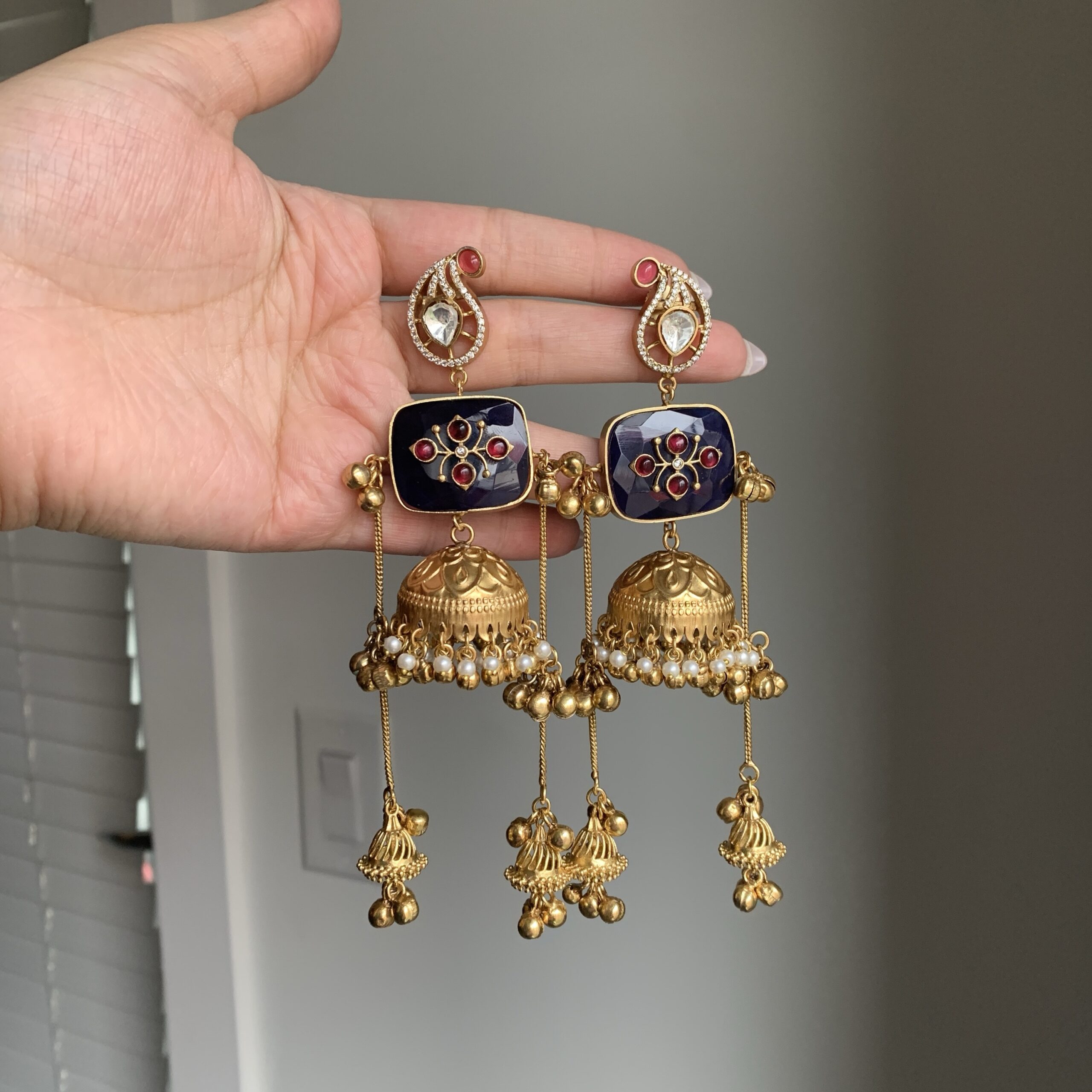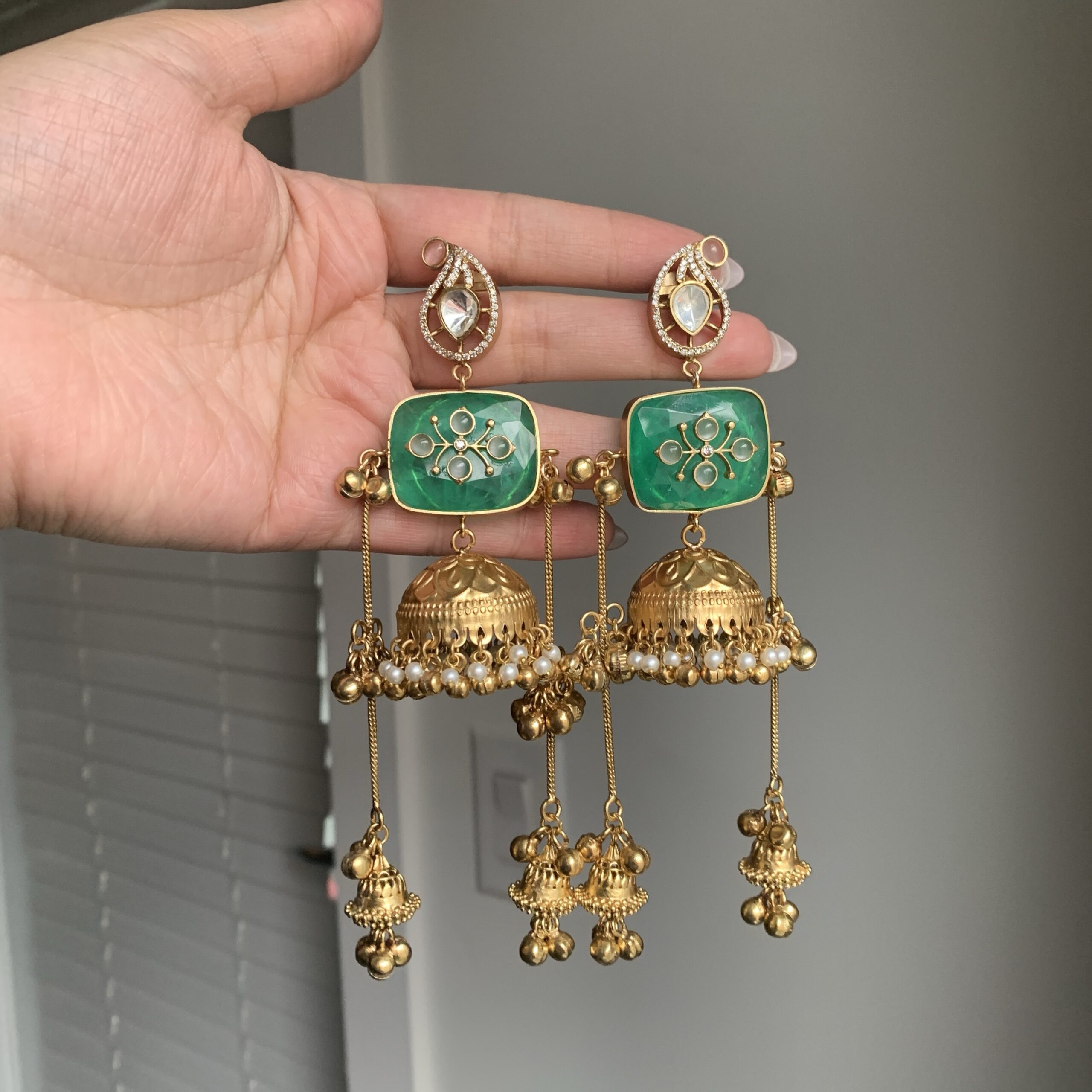 These antique gold–finished statement earrings feature a refined stud top paired with a structured square accent and a classic jhumka drop. Detailed with ornate motifs, soft-toned accents, and cascading ghungroo elements, they offer graceful movement and rich traditional appeal. Perfect for festive occasions, weddings, and elevated ethnic or fusion styling.