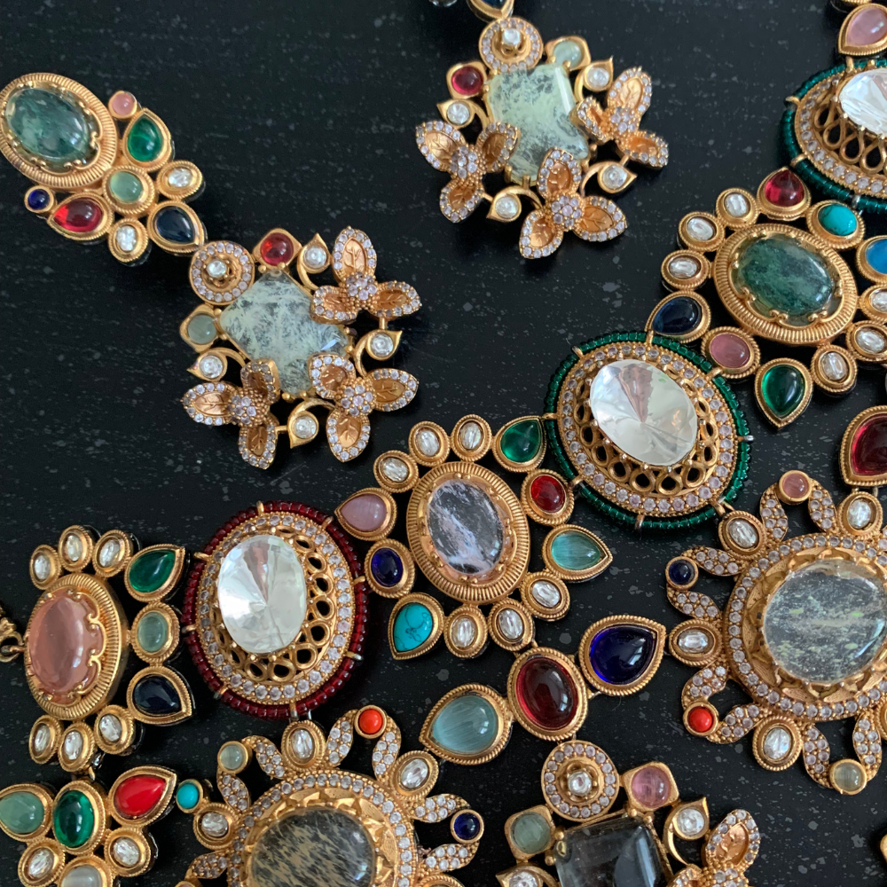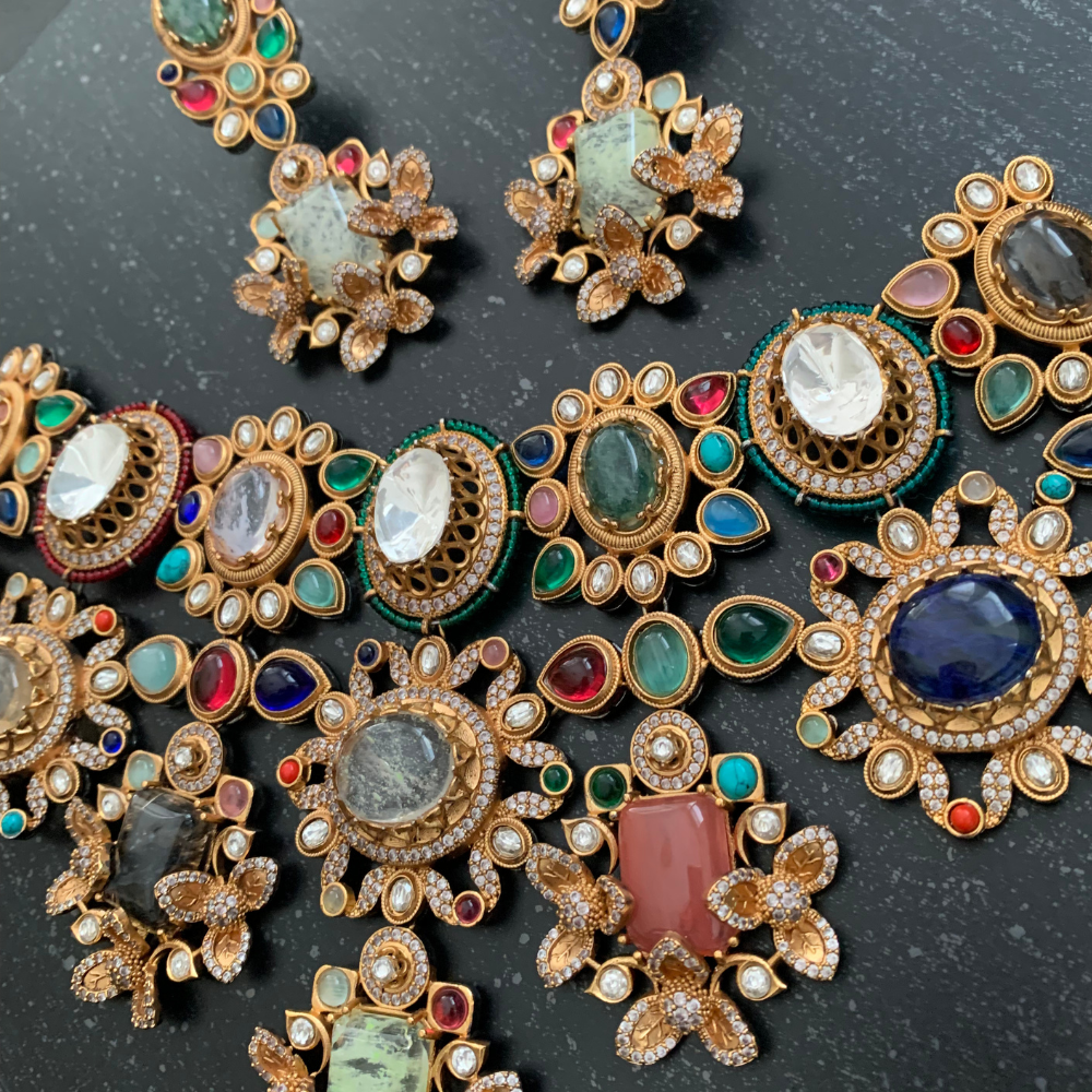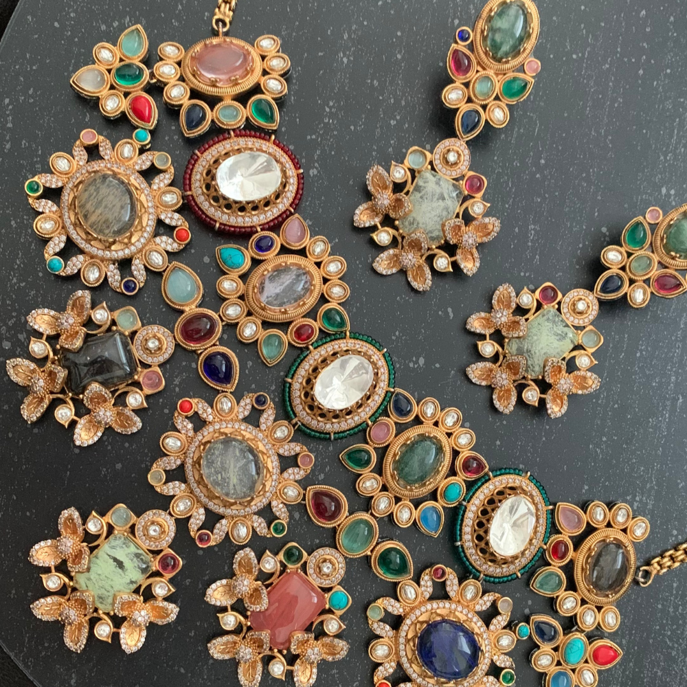 A luxurious Sabyasachi-inspired set, featuring a detailed choker and necklace paired with earrings. Perfect for brides who desire opulence and tradition.