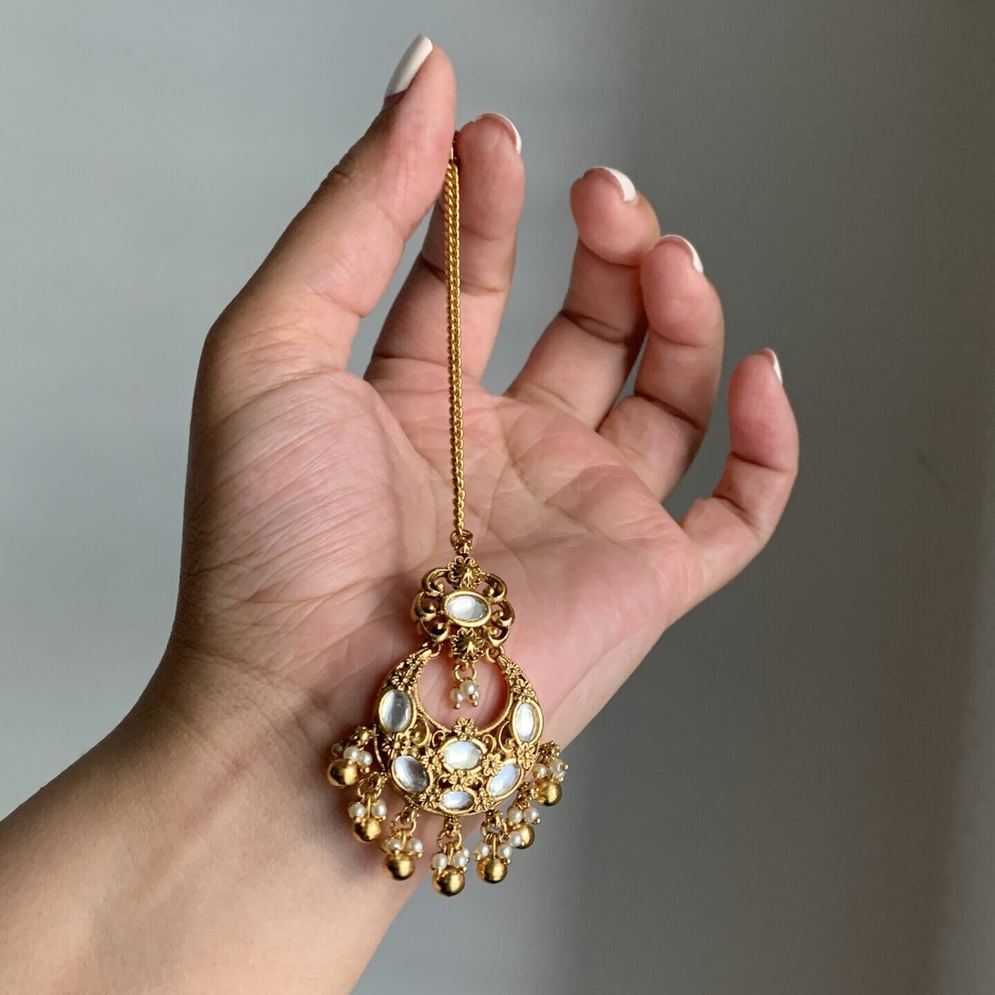 Inspired by the glowing crescent moon, this necklace set features a radiant design with gold and pearl accents. The bottom’s moon shape adds a magical touch, while the matching earrings complete this ethereal look.