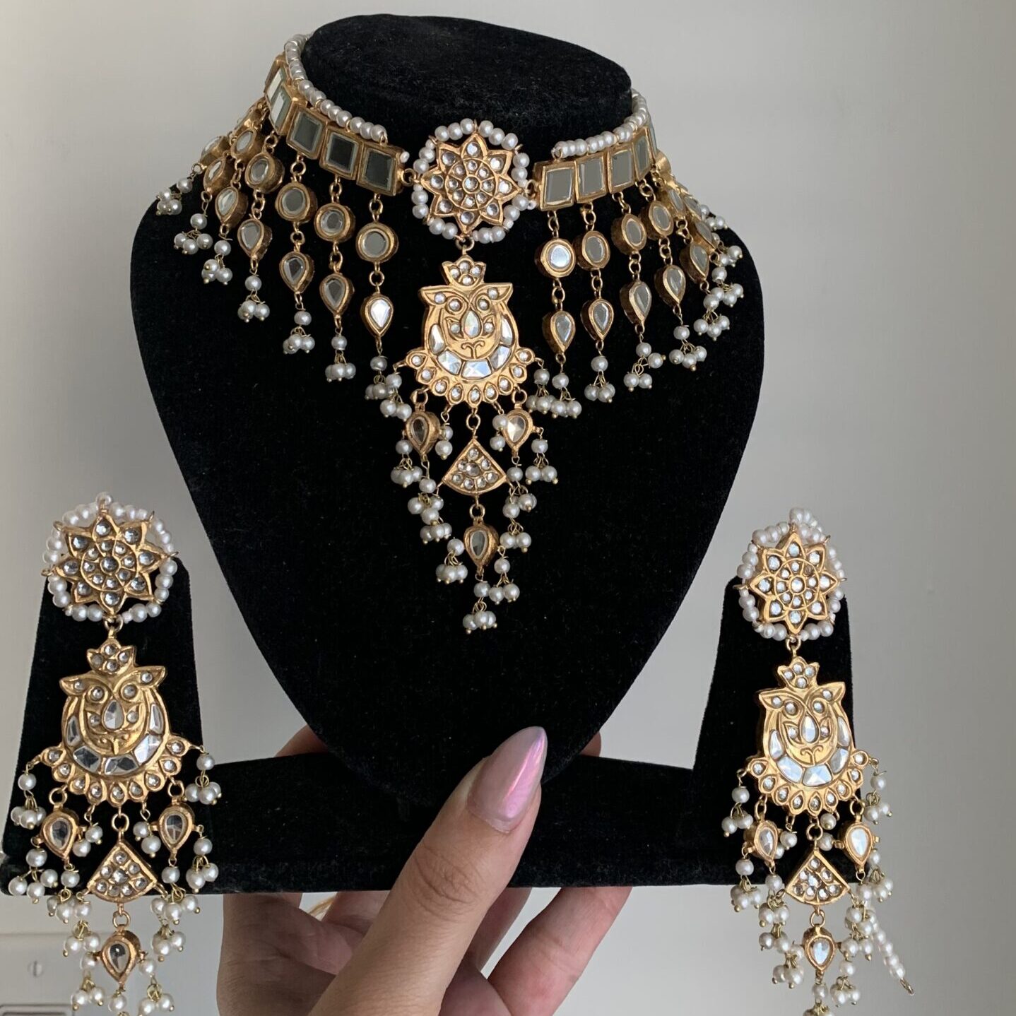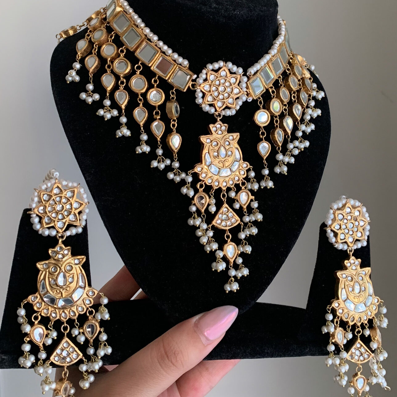 A graceful Thappa Kundan necklace set accented with dangling pearls. Comes complete with matching earrings and tikka—perfect for brides seeking a traditional yet delicate look.