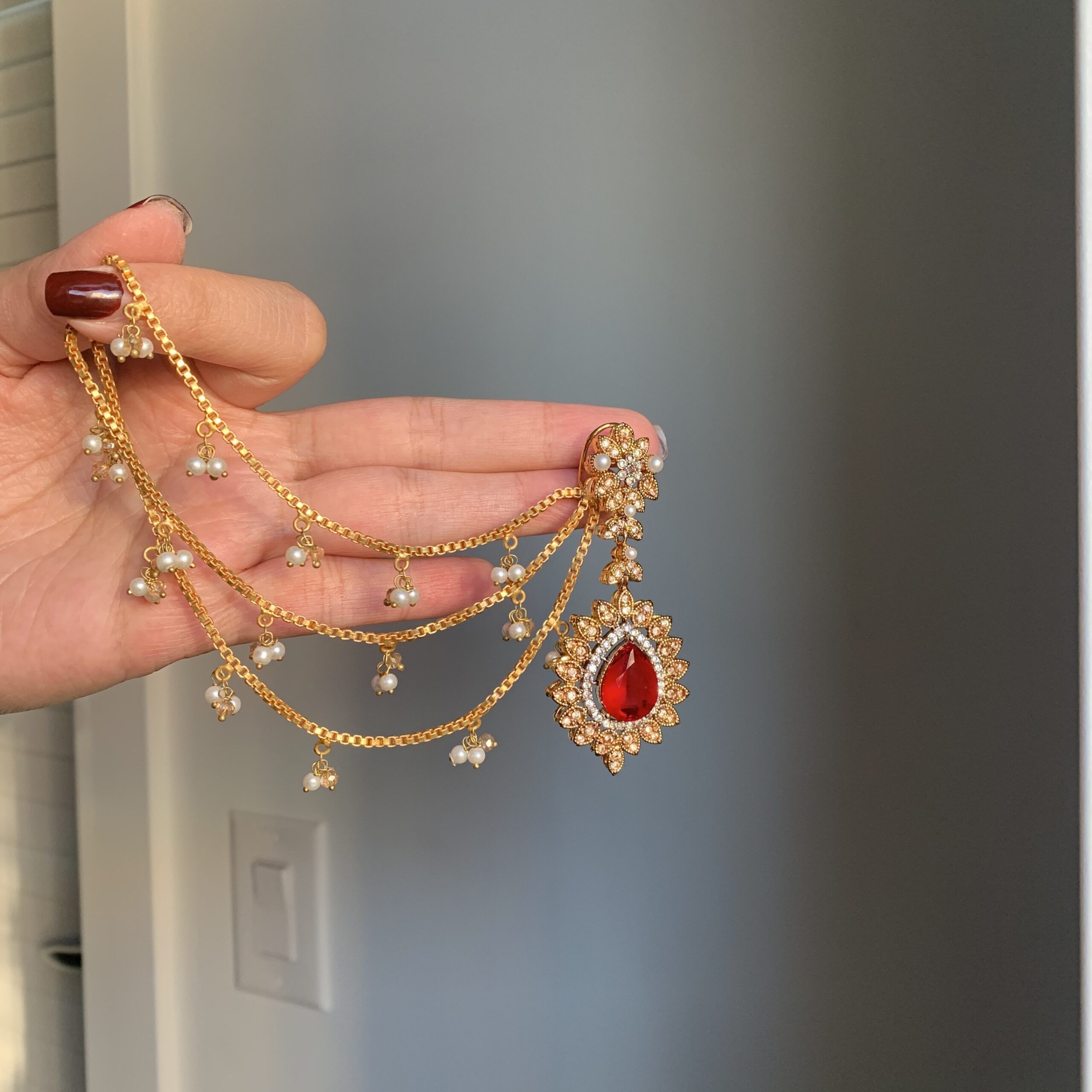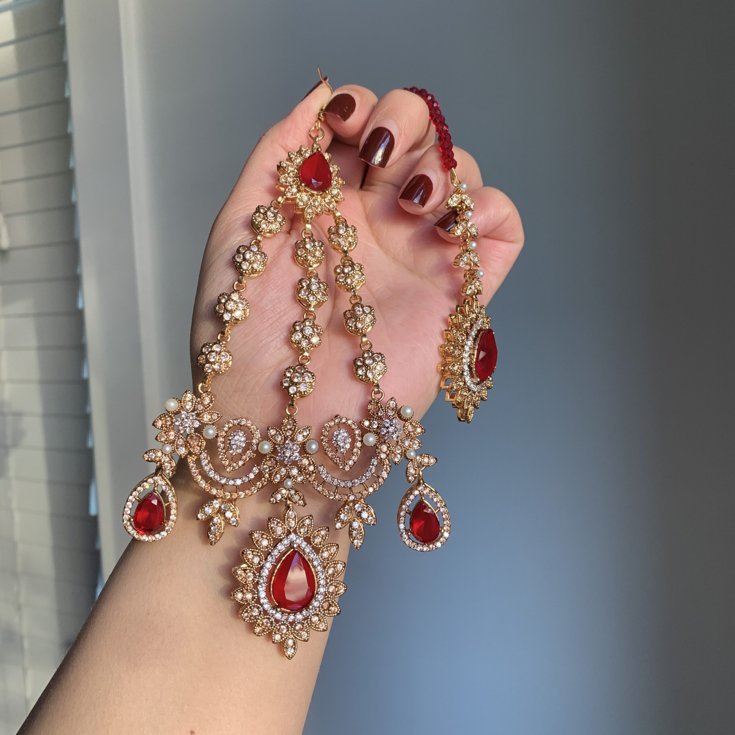 An opulent bridal set crafted in deep ruby of soft pink tones, this design pairs shimmering stones with intricate floral filigree for a radiant, high-impact look. The matching earrings, tikka, and passa complete the ensemble with perfect balance, creating a timeless statement made for the grandest celebrations.