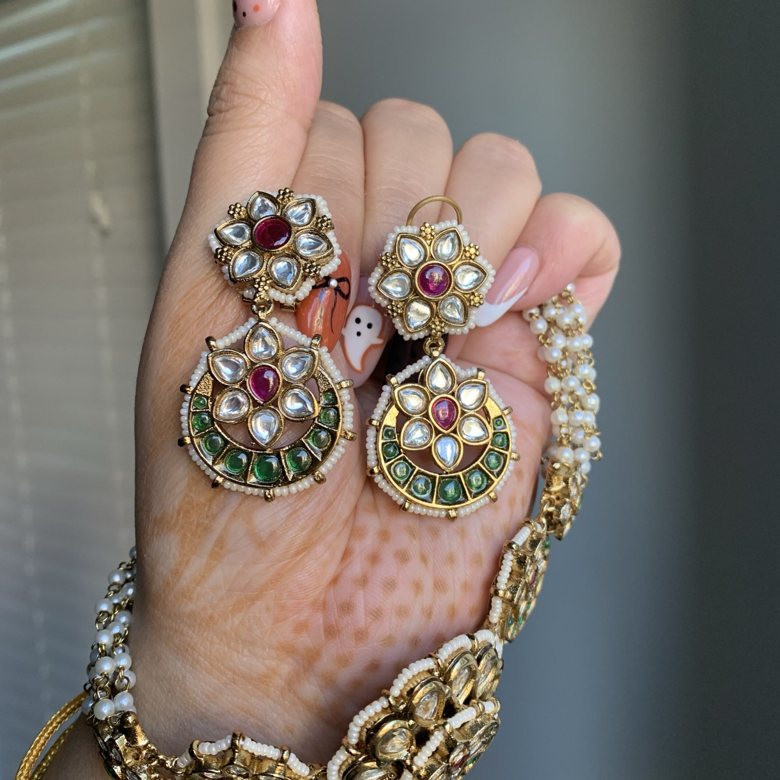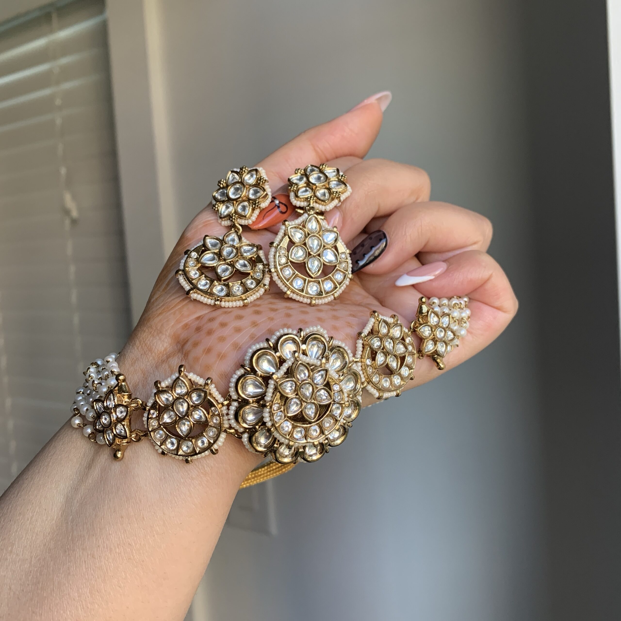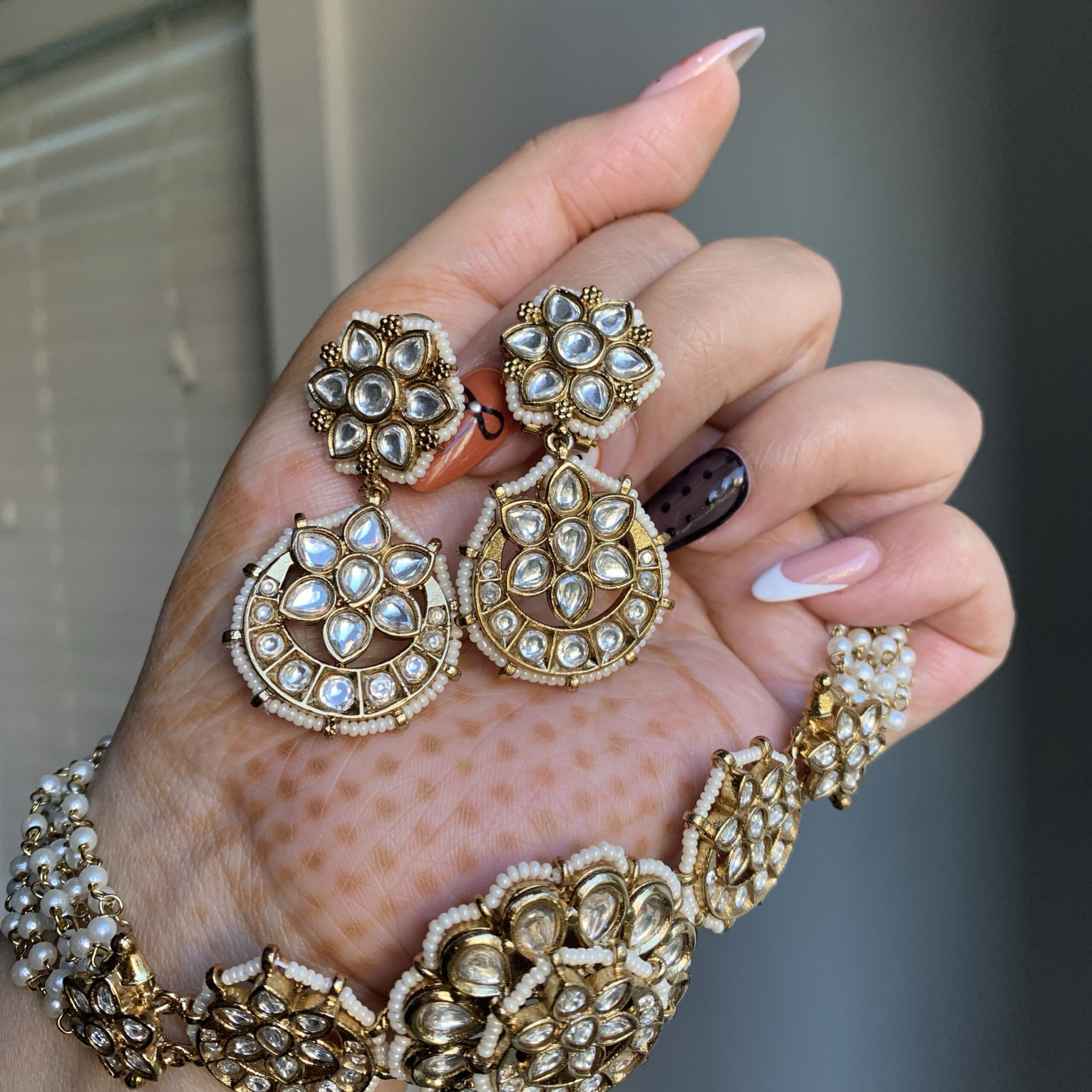 This stunning Kundan necklace set is a timeless blend of tradition and elegance. The necklace features intricate floral motifs embellished with high-quality Kundan stones and pearls, giving it a radiant, regal charm. Each element is carefully handcrafted, showcasing fine detailing and golden hues that beautifully reflect light. The set comes with matching earrings.