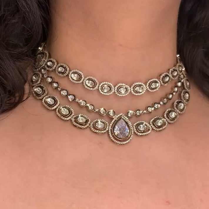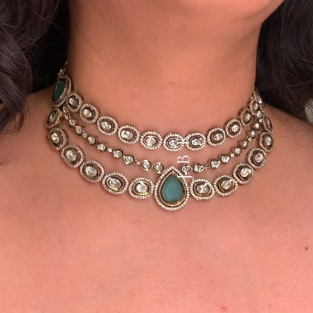 A beautifully layered kundan choker, designed with three delicate rows that shimmer softly against the skin and highlight the emerald-tone centrepieces. Finished with matching earrings that mirror the same graceful sparkle, it creates a perfectly balanced and refined look.