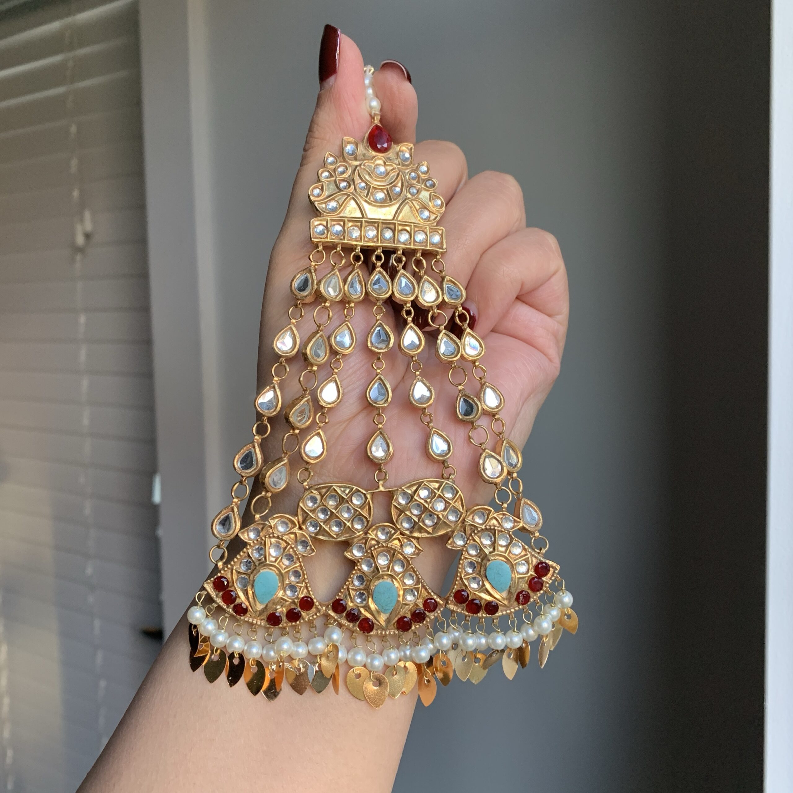 Designed to stand out, this choker set features bold stonework and refined embellishments with graceful movement. Paired with coordinating earrings, tikka, and passa for a complete traditional ensemble.