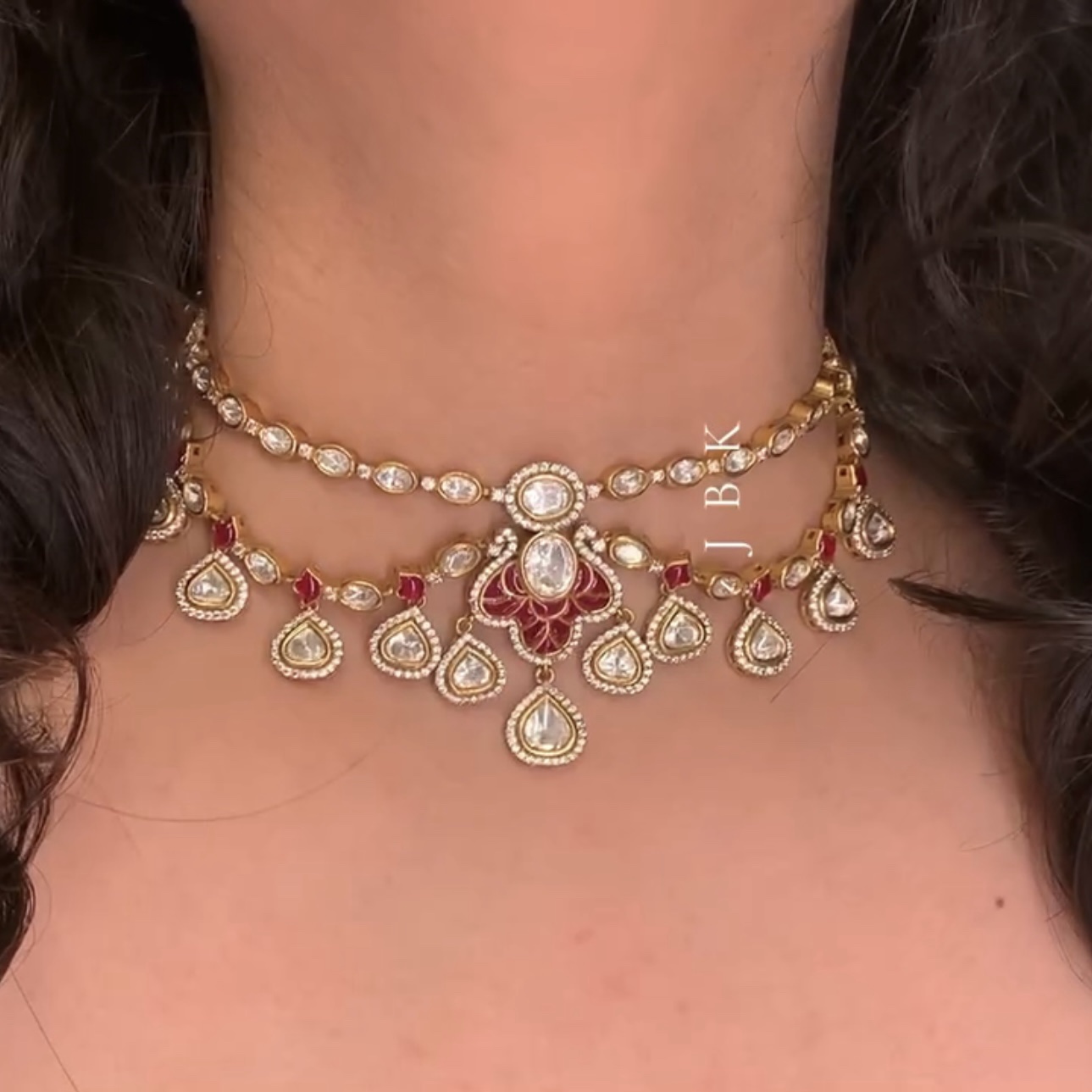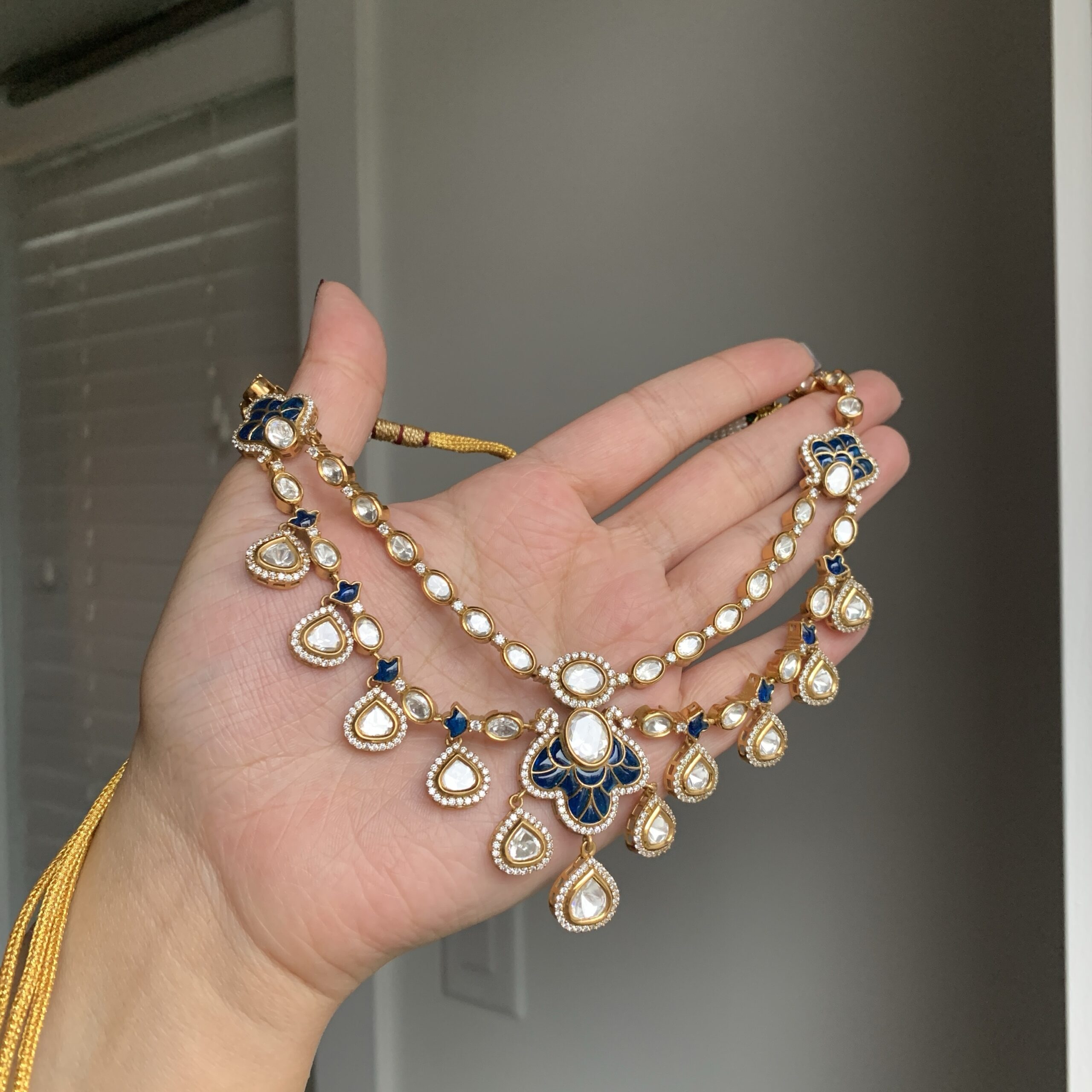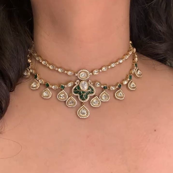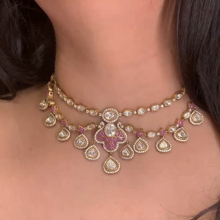 Inspired by the serene beauty of the lotus flower, this necklace features sparkling diamonds and various colorful accents, creating a perfect balance of elegance and grace. The matching earrings and tikka enhance the set’s captivating beauty.