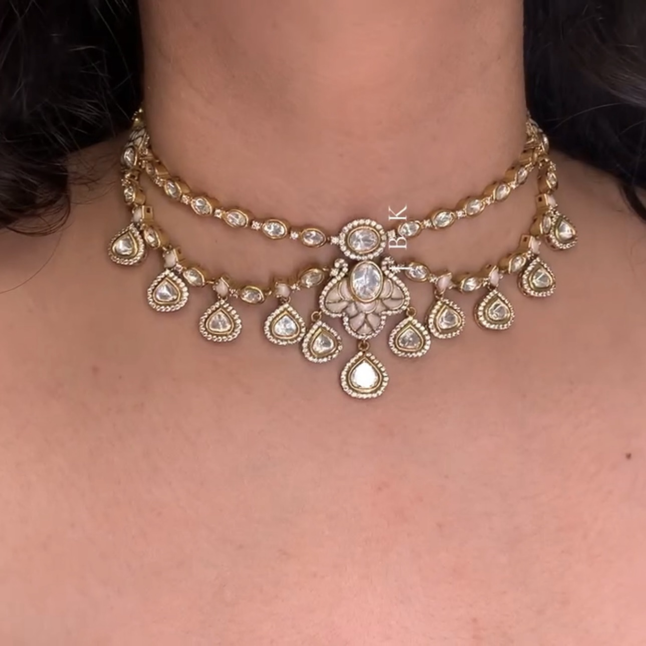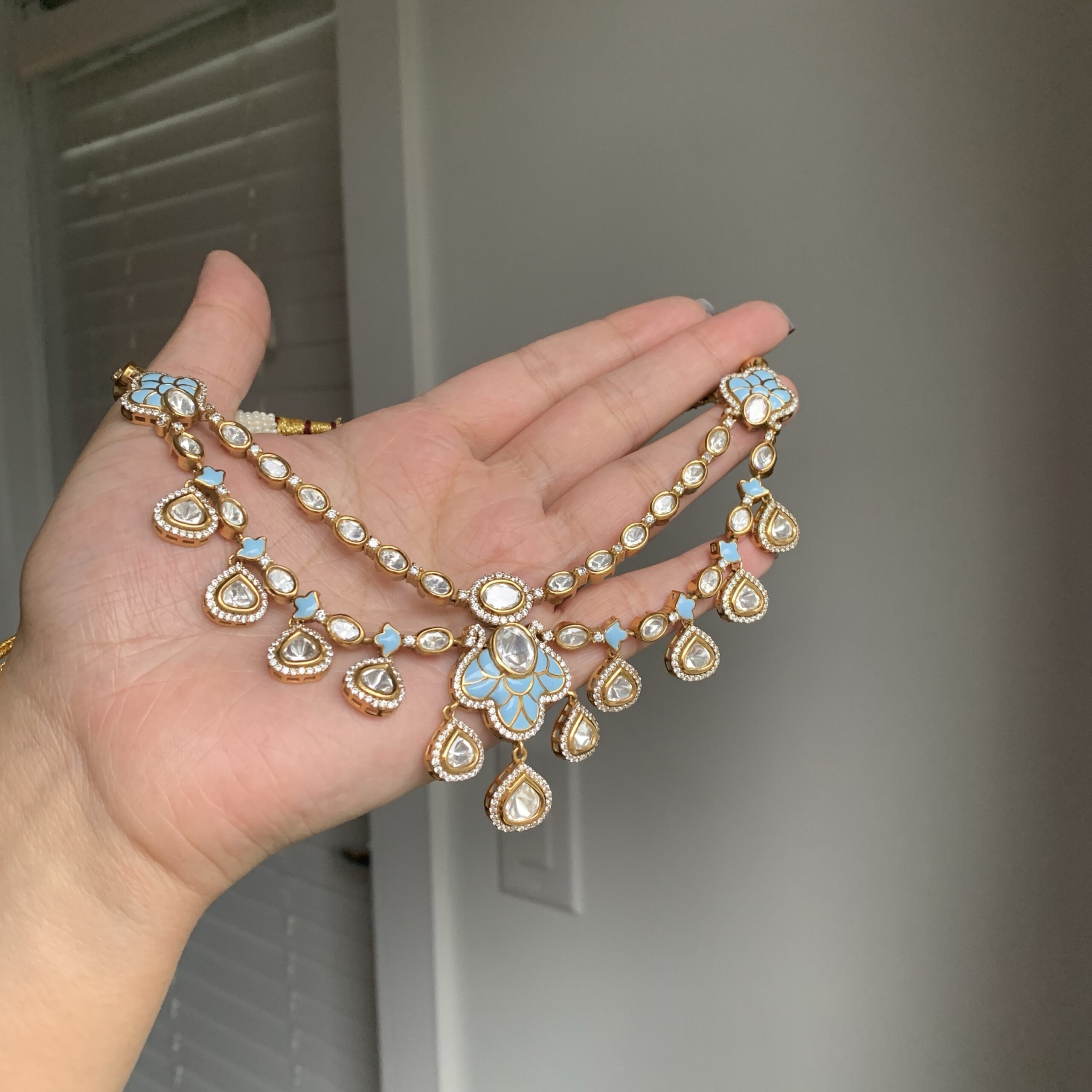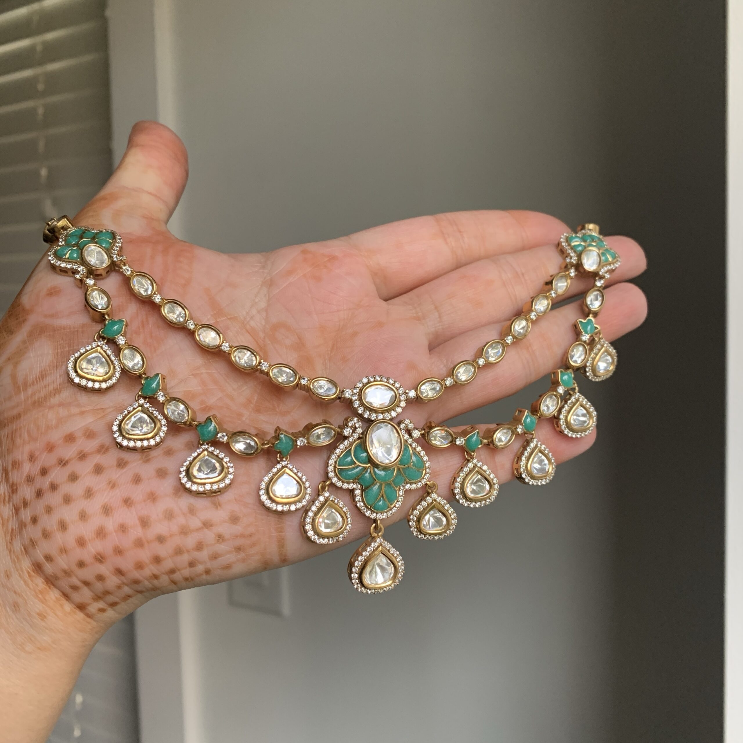 Inspired by the serene beauty of the lotus flower, this necklace features sparkling diamonds and various colorful accents, creating a perfect balance of elegance and grace. The matching earrings and tikka enhance the set’s captivating beauty.
