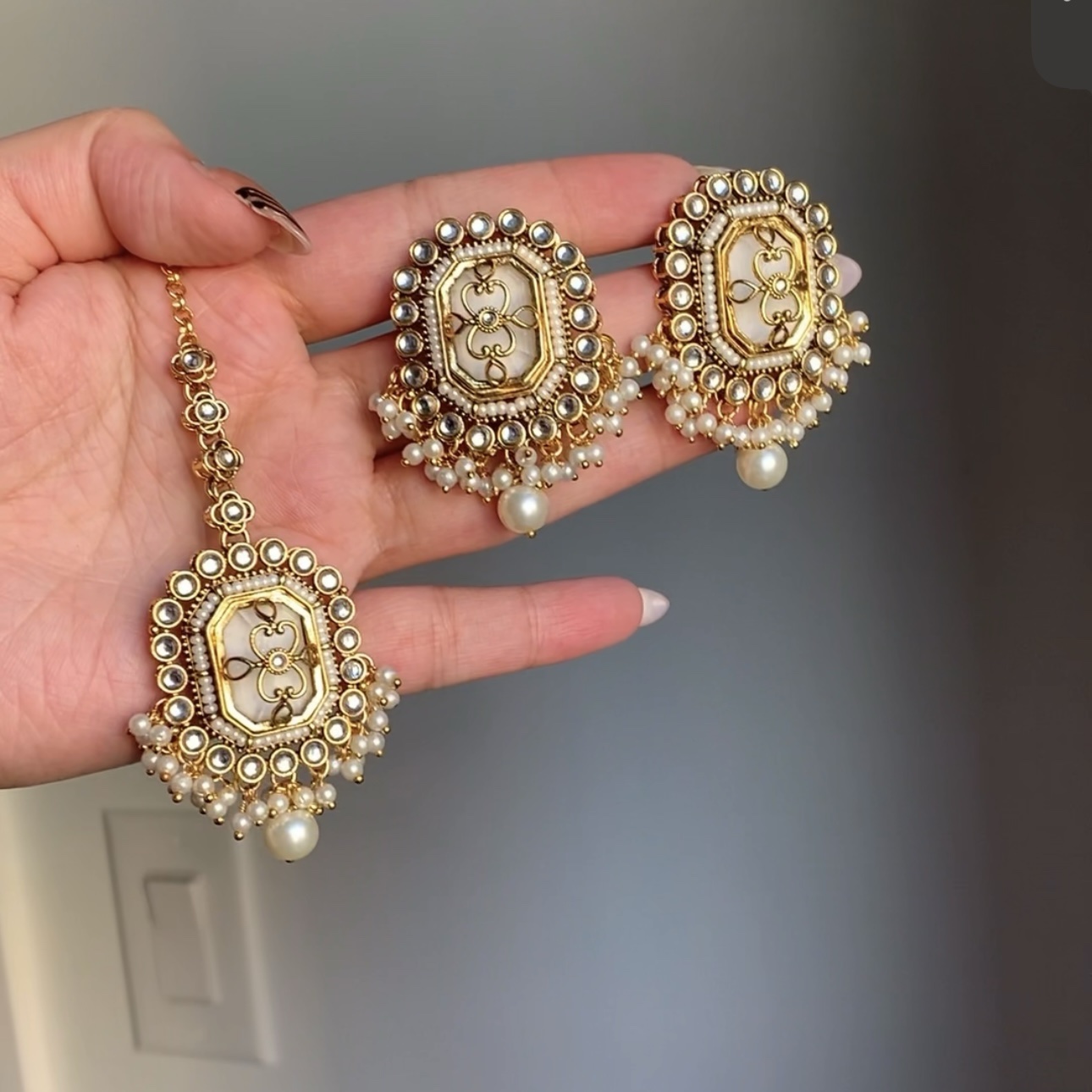 A striking choker set featuring intricate kundan detailing, finished with matching earrings and a coordinating tikka. Designed to bring a bold statement to bridal and festive looks while maintaining timeless elegance.