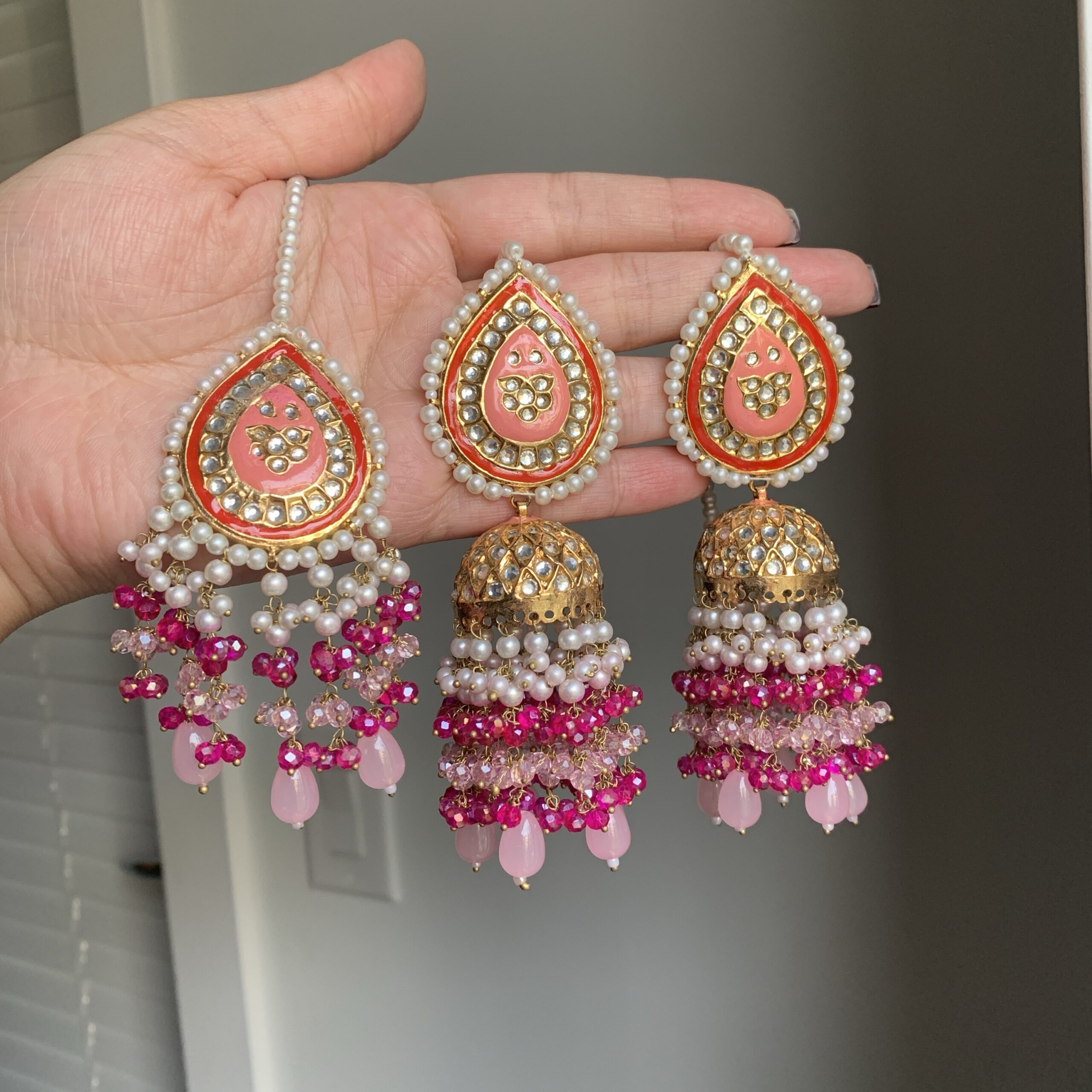 Luxuriously detailed jhumkis featuring a luminous kundan teardrop design paired with pearl clusters and shimmering crystal layers. Paired with a coordinating tikka, this set adds an effortlessly royal finish to any festive or bridal look.
