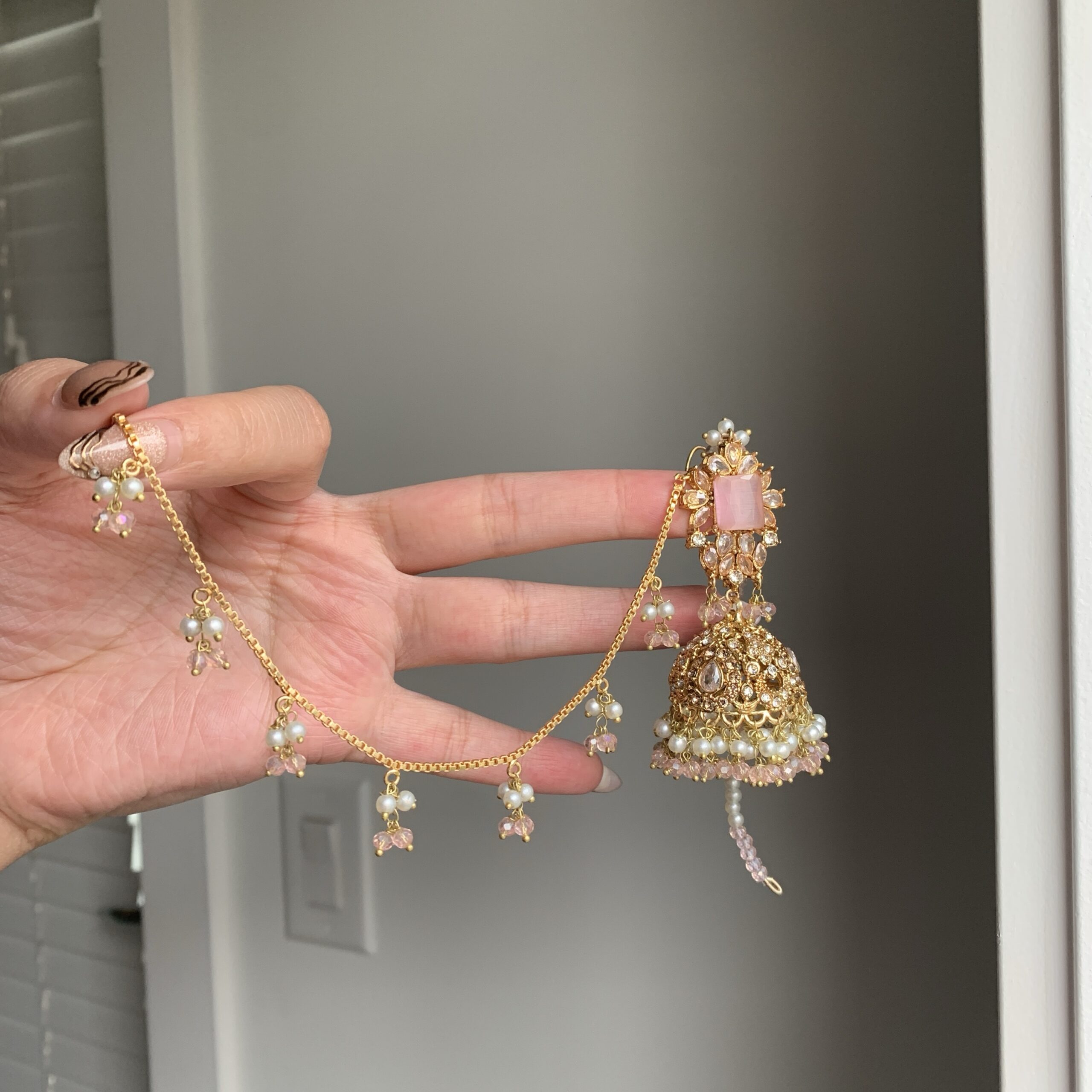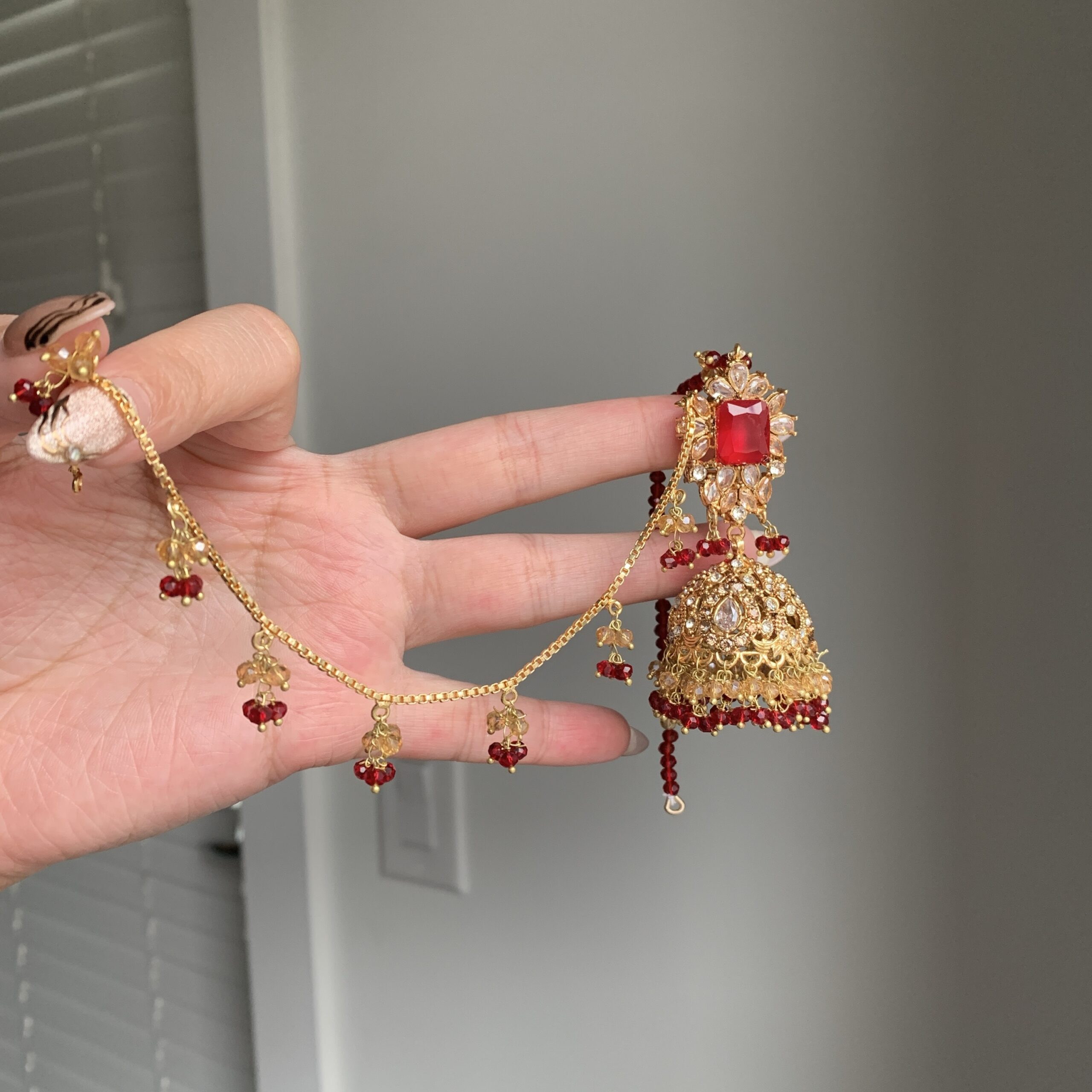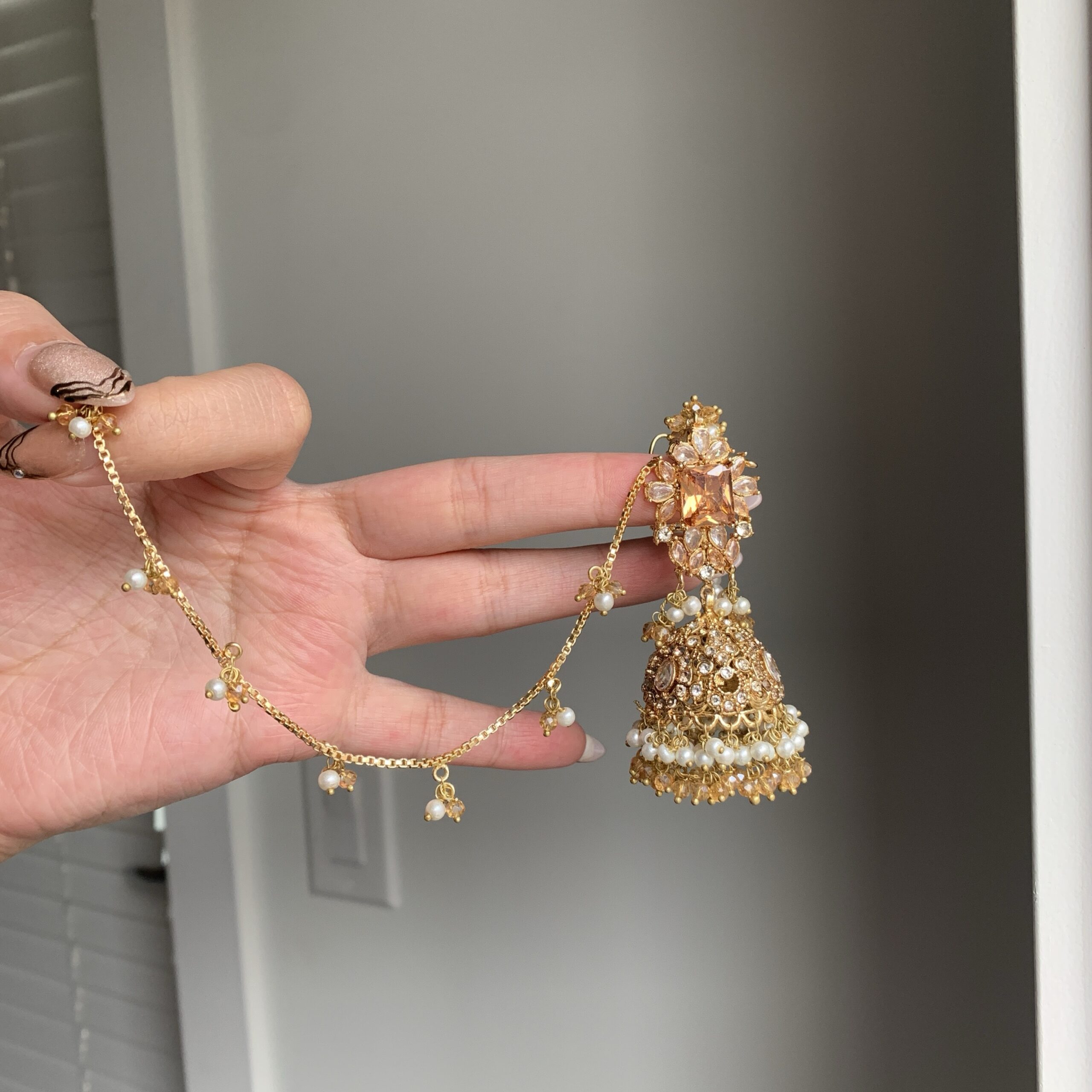 This coordinated earrings and tikka set is designed with a radiant crystal top, intricate jhumka detailing, and dainty hanging beads that move with every step. The perfect piece to elevate both simple and heavy outfits, from ghararas to lehengas.