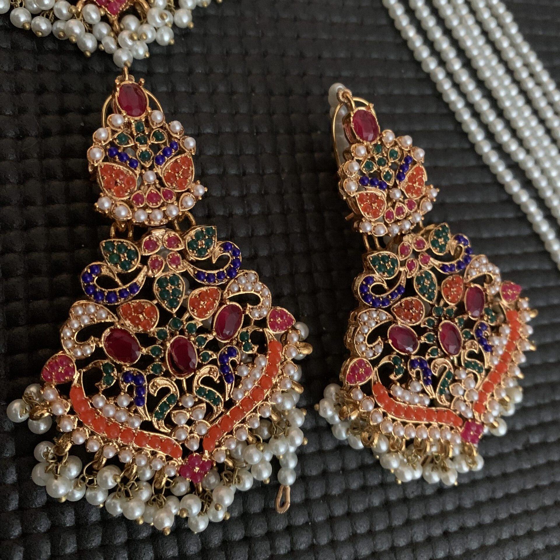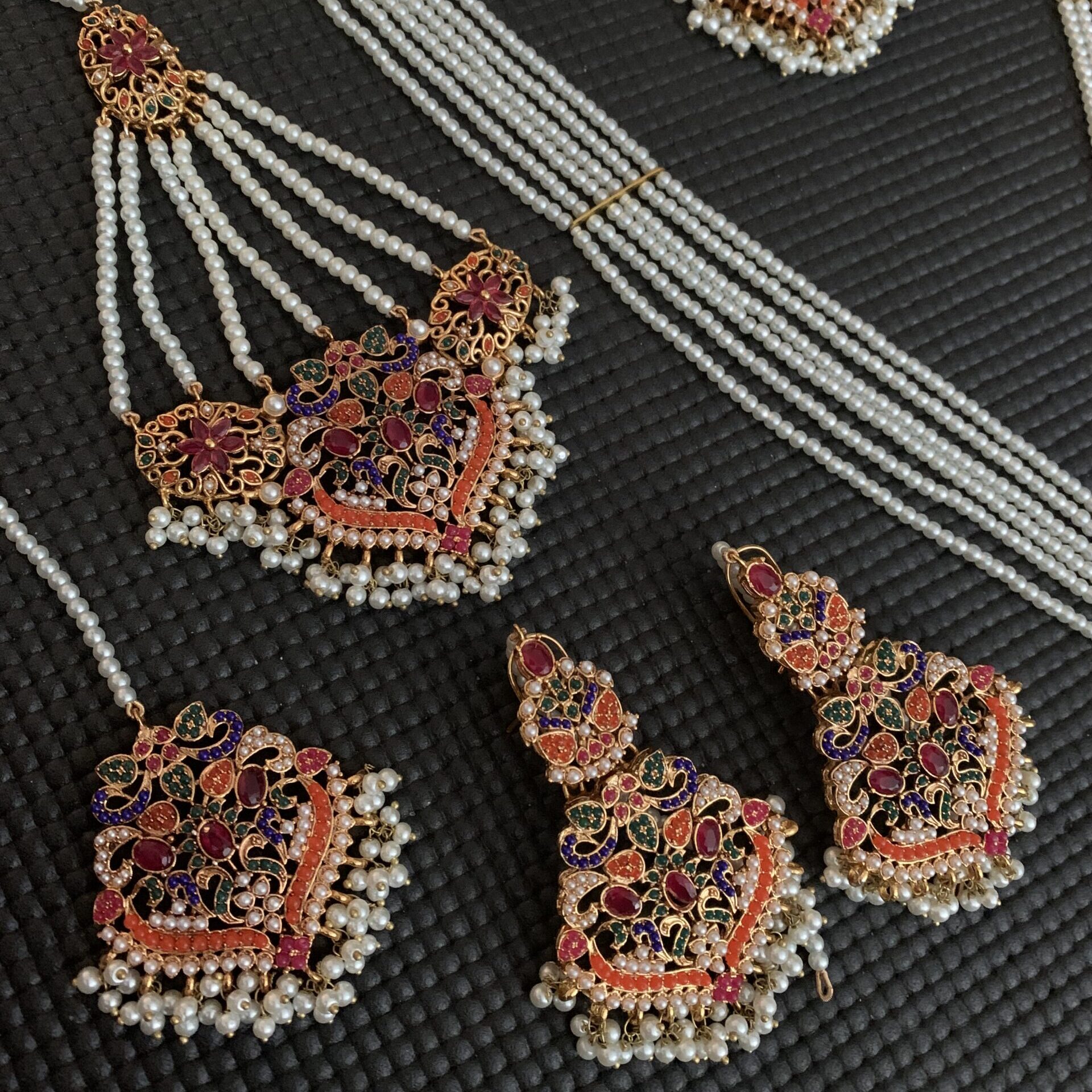A colorful double-layer necklace in traditional Nauratan style, symbolizing joy and celebration. Paired with elegant earrings, jhoomer, and tikka.