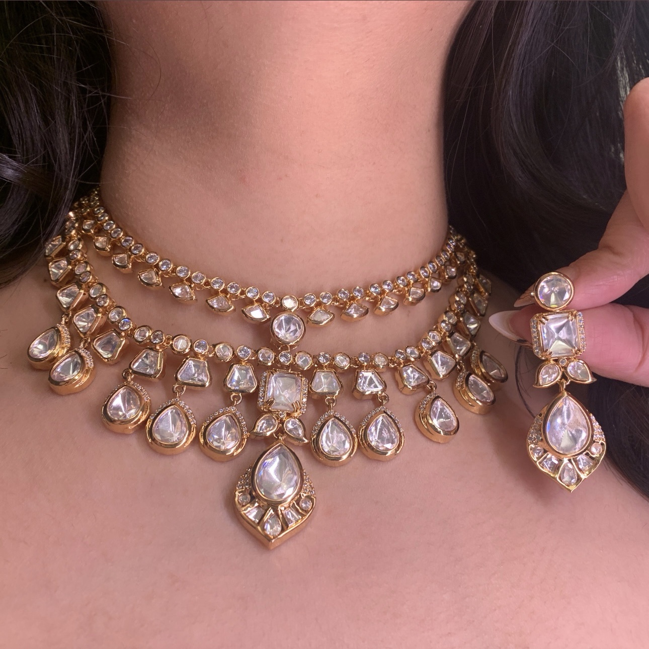 Designed for timeless elegance, this necklace features dual layers of crystal accents finished with a statement central drop. The coordinating earrings mirror the teardrop detailing, completing the look with subtle sophistication. A versatile set that can be styled higher or lower depending on the outfit.