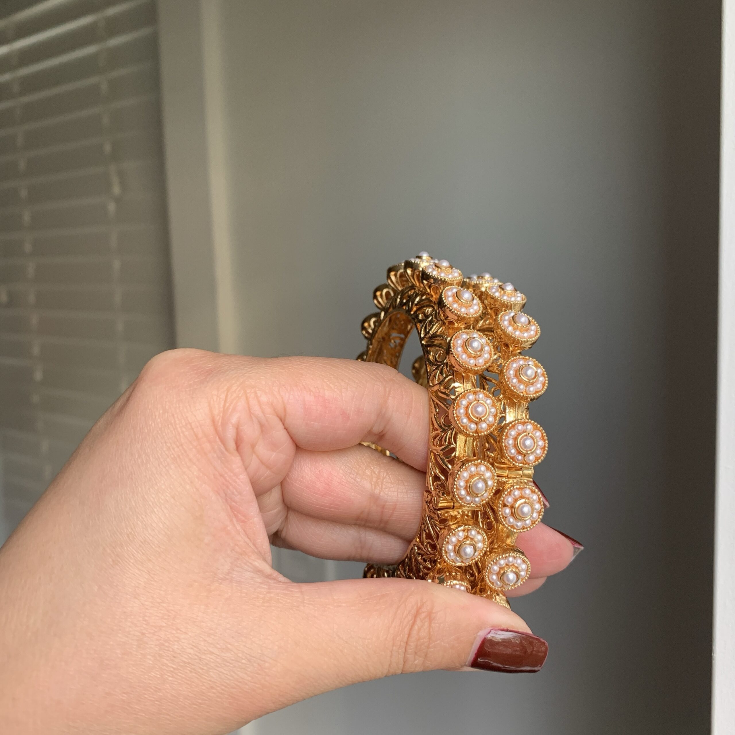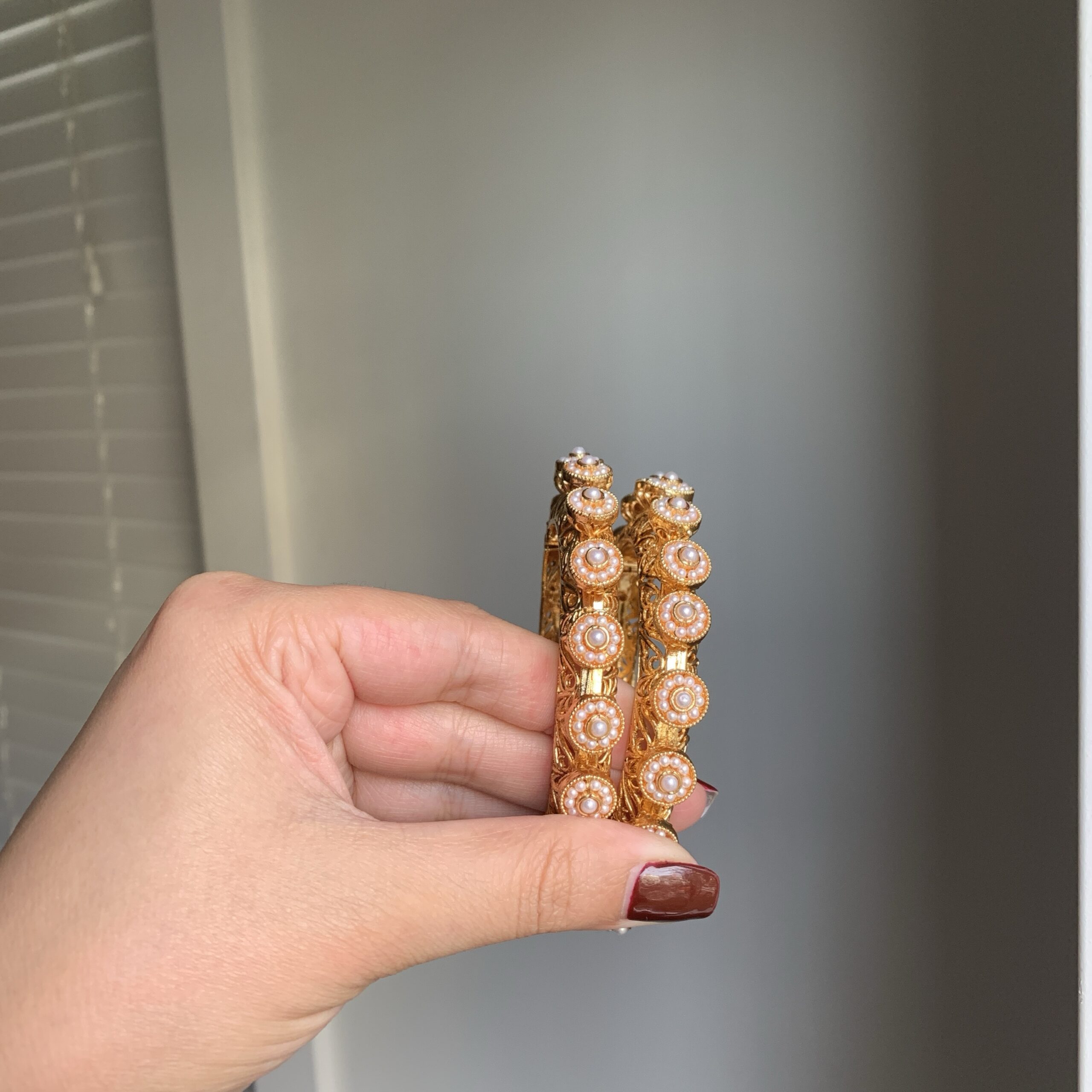 Adorned with lustrous pearls and set in intricate antique gold, these bangles create a sophisticated yet timeless look. Their delicate design brings a perfect blend of vintage charm and modern elegance.