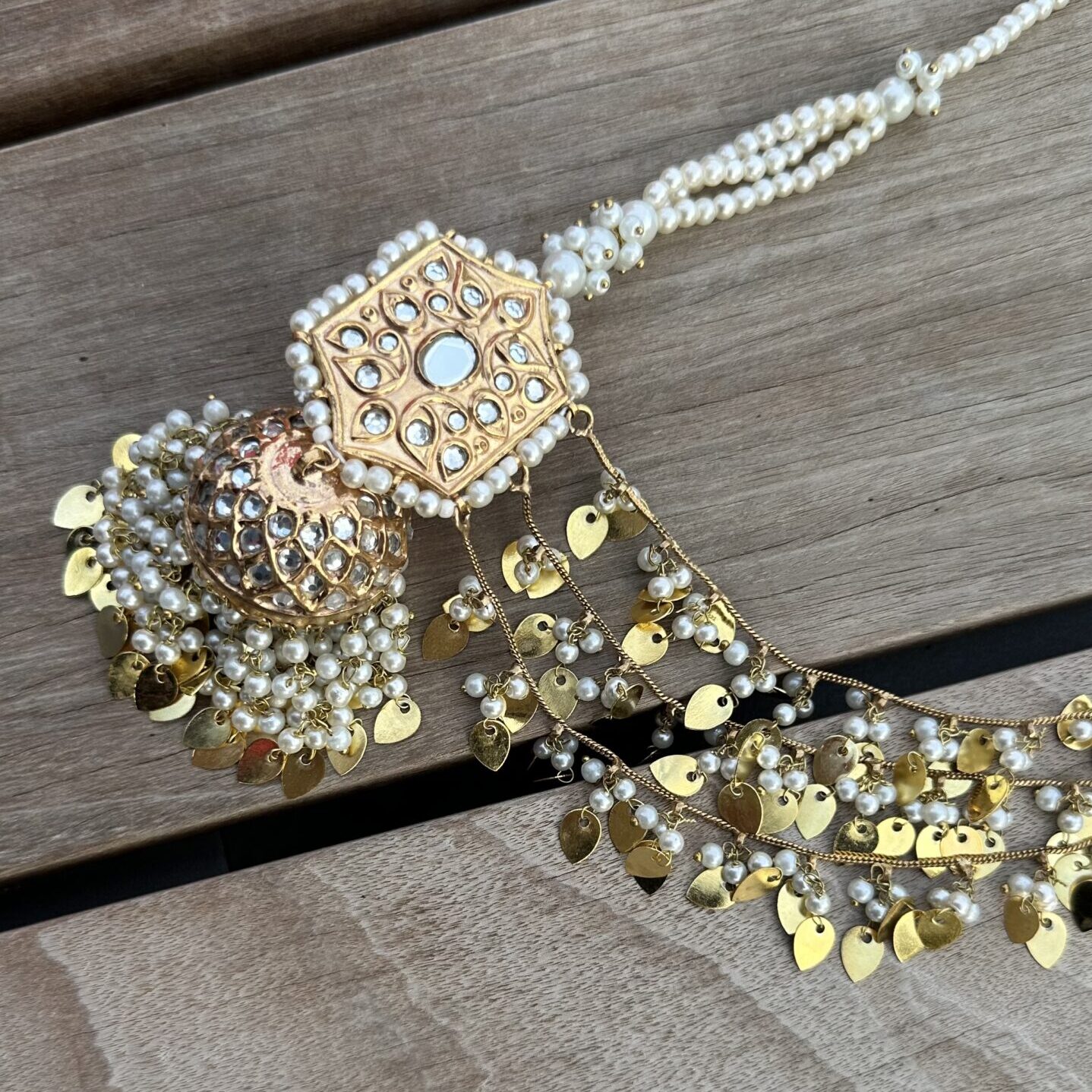 Designed to bring out the beauty of your special day, this set includes a stunning necklace, tikka, and jhoomer, all adorned with golden floral patterns, sparkling pearls, and sequins. Its opulent design offers a rich, festive look that’s perfect for bridal wear or grand celebrations.