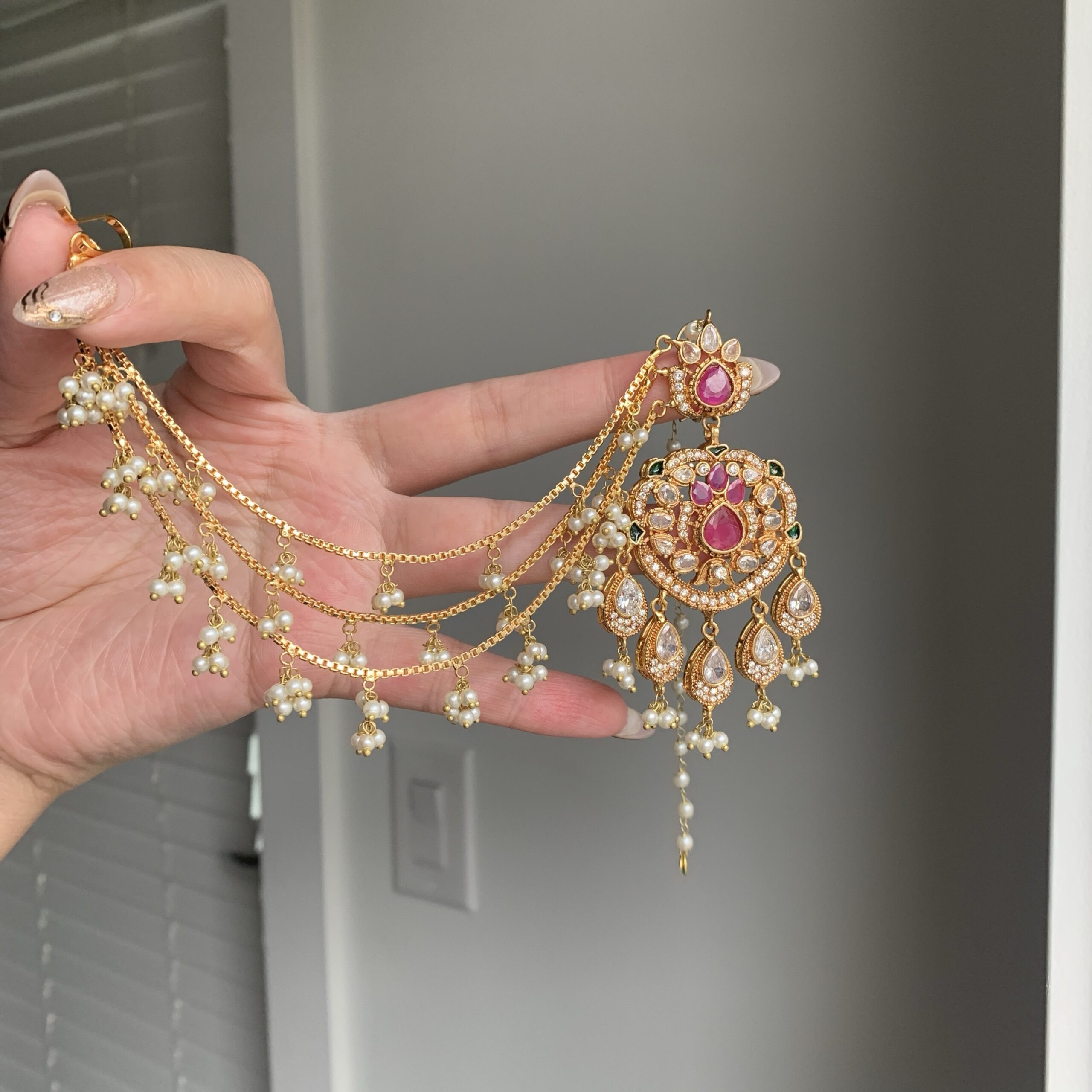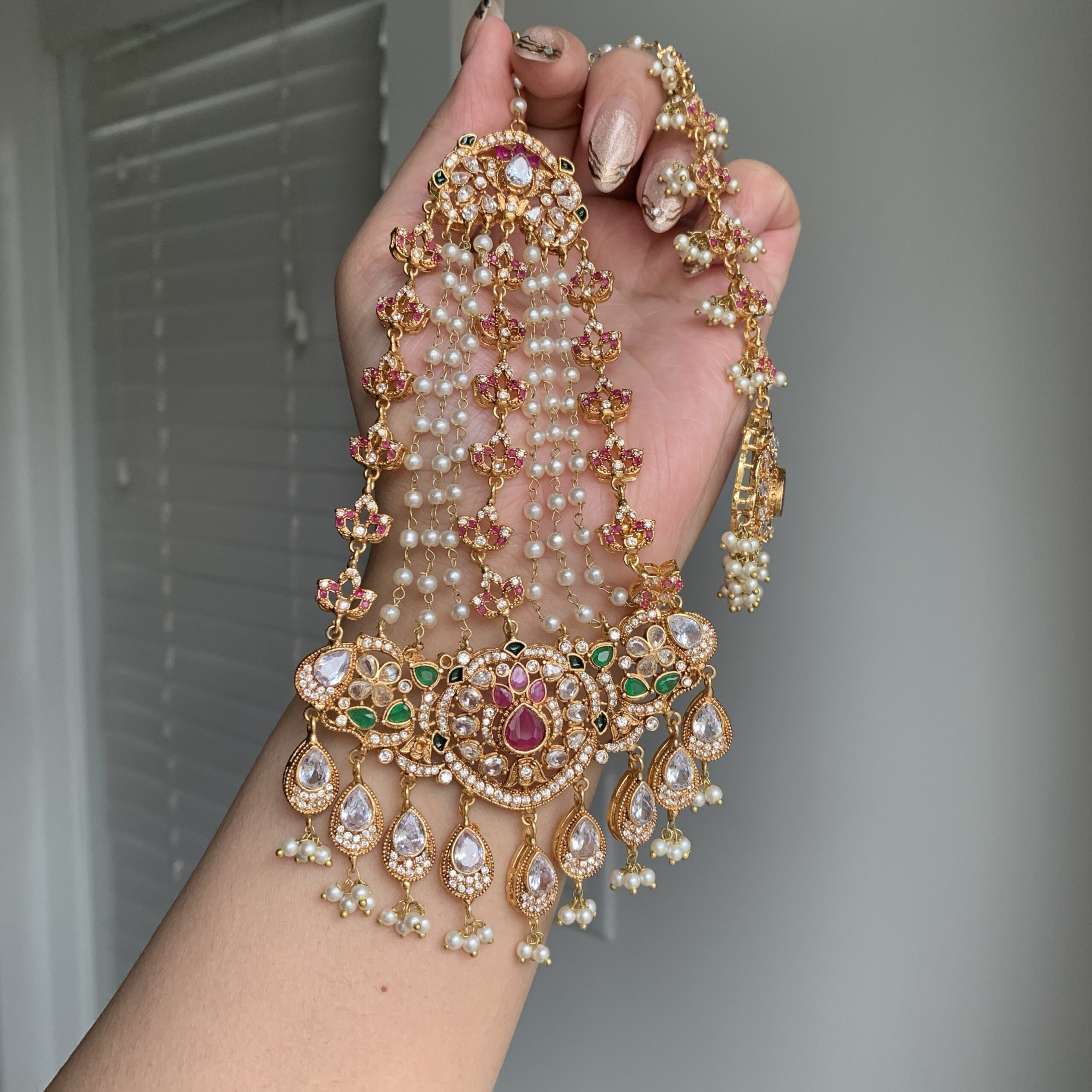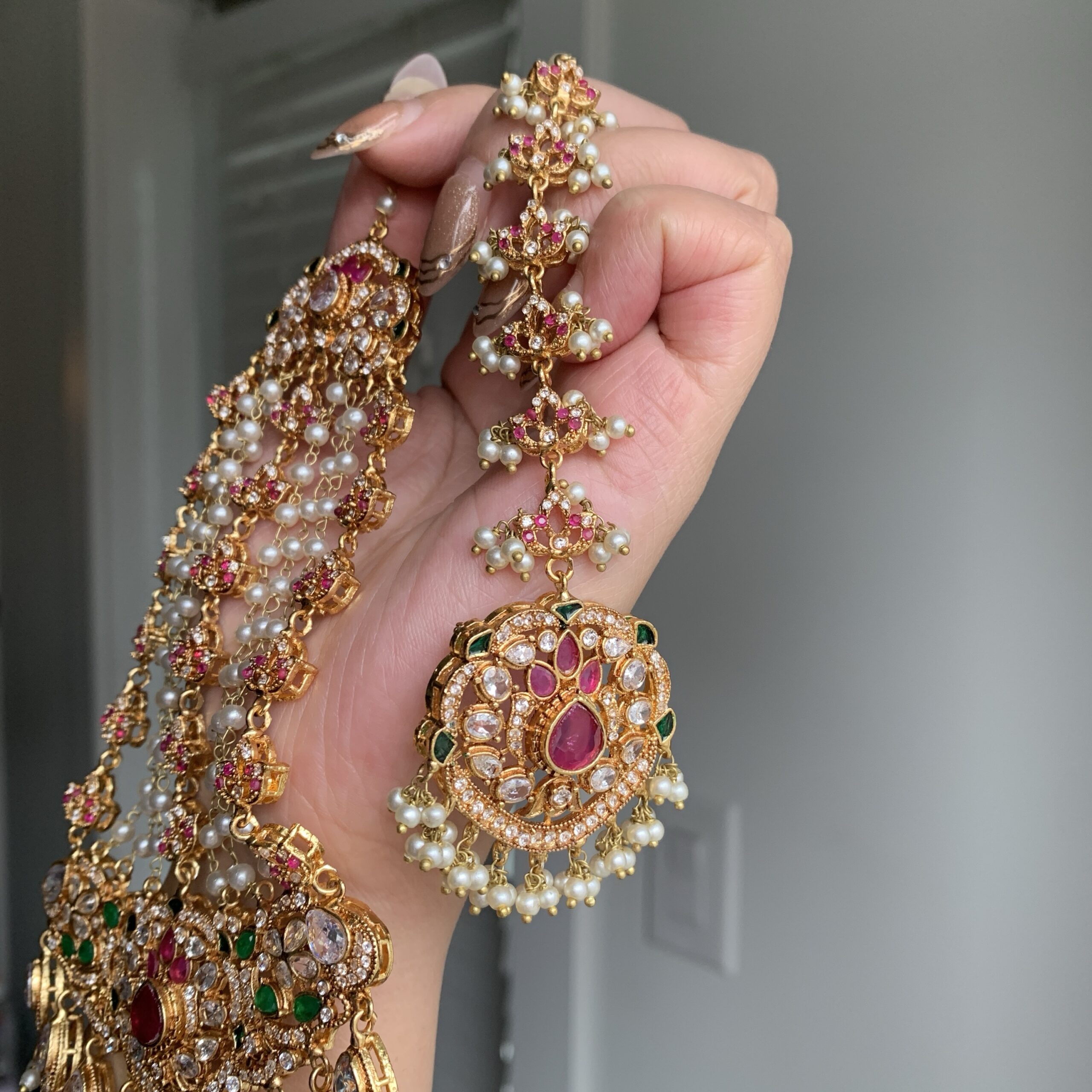 This luxurious complete set showcases ornate craftsmanship, shimmering stones, and graceful pearl drops. Paired with matching earrings, tikka, and jhoomer, the full ensemble offers a refined, statement-worthy finish ideal for special occasions.