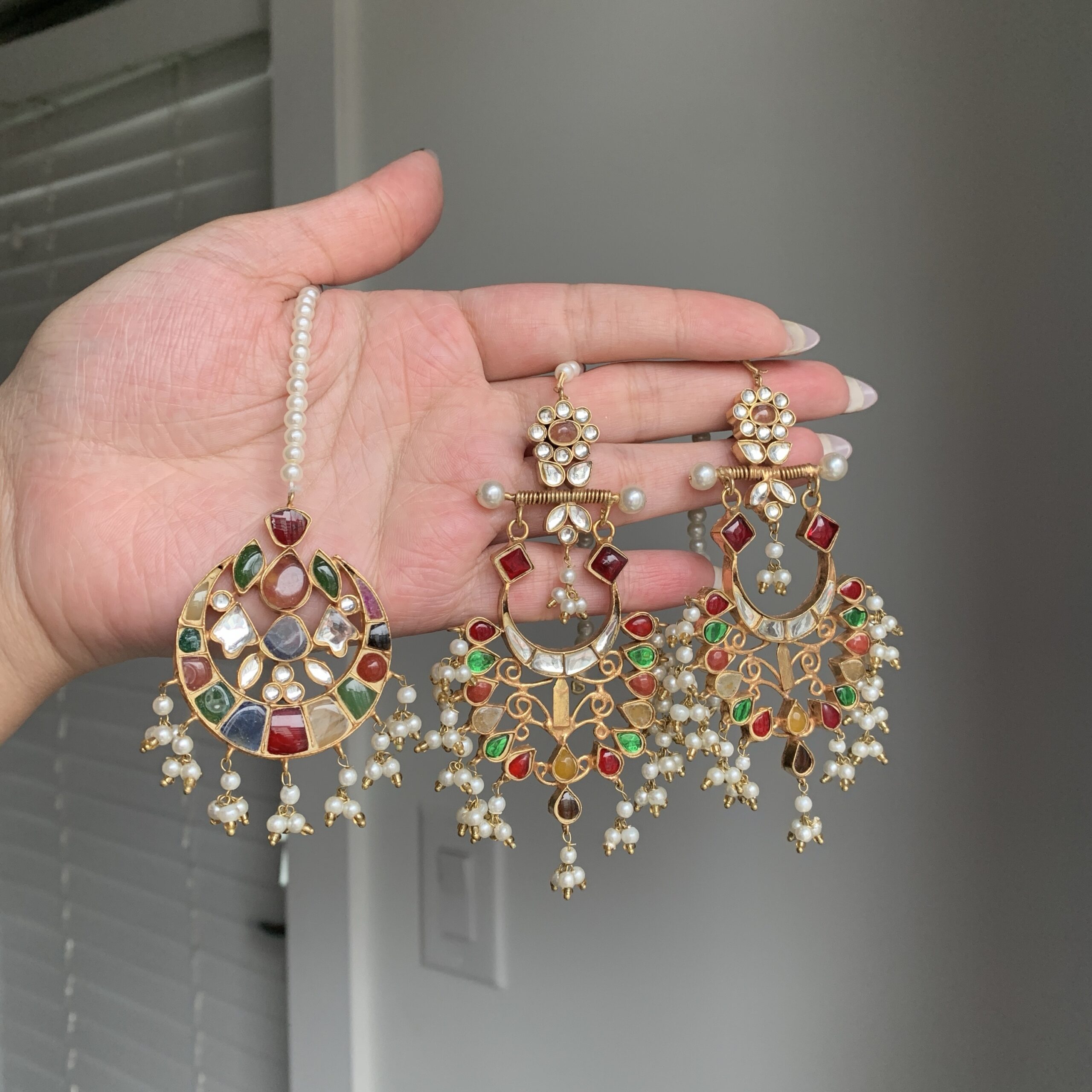 Crafted with intricate gold detailing and vibrant stonework, this set is complemented by matching earrings and a coordinating tikka for a fully polished look. Each piece works together to create a rich, eye-catching finish that elevates traditional outfits effortlessly.
