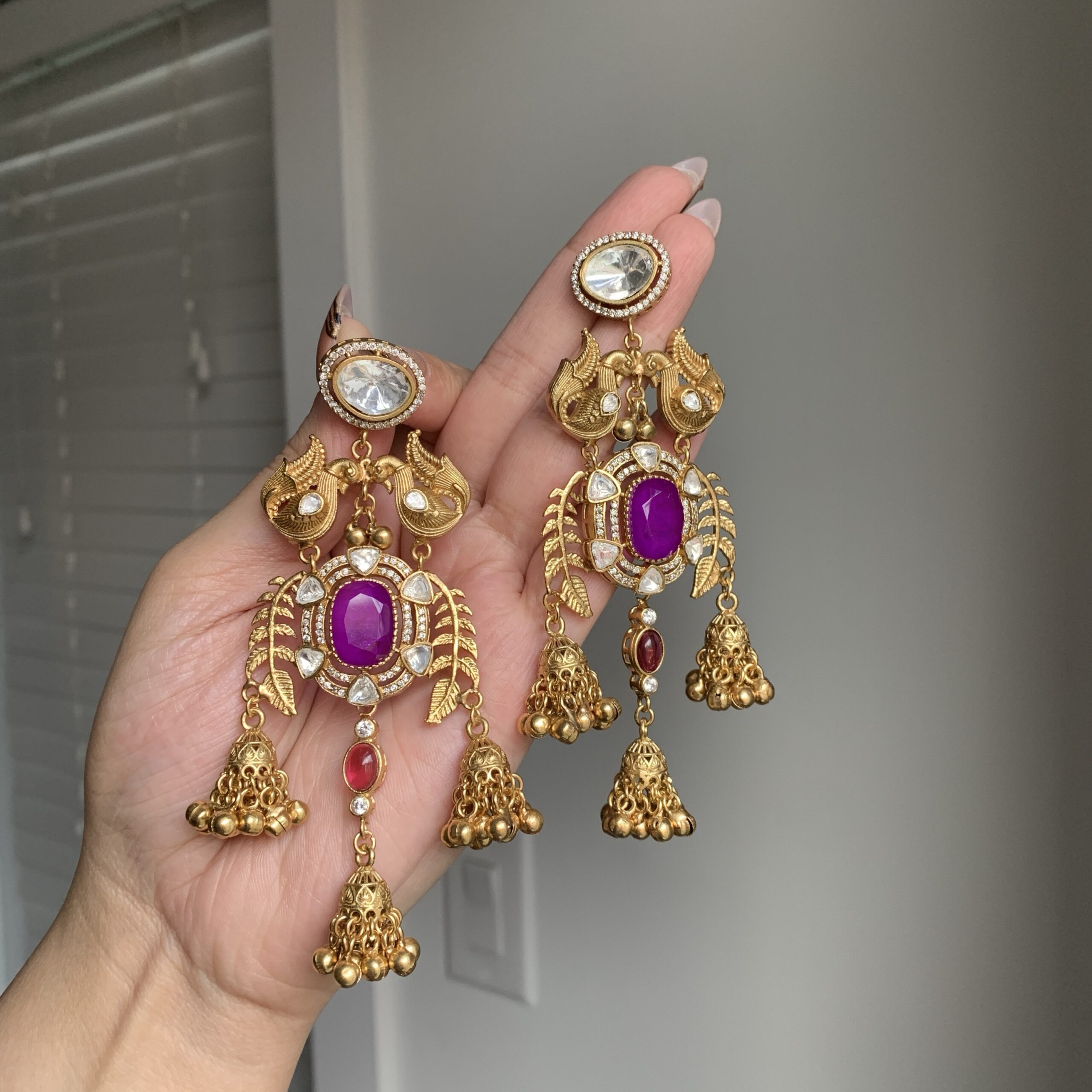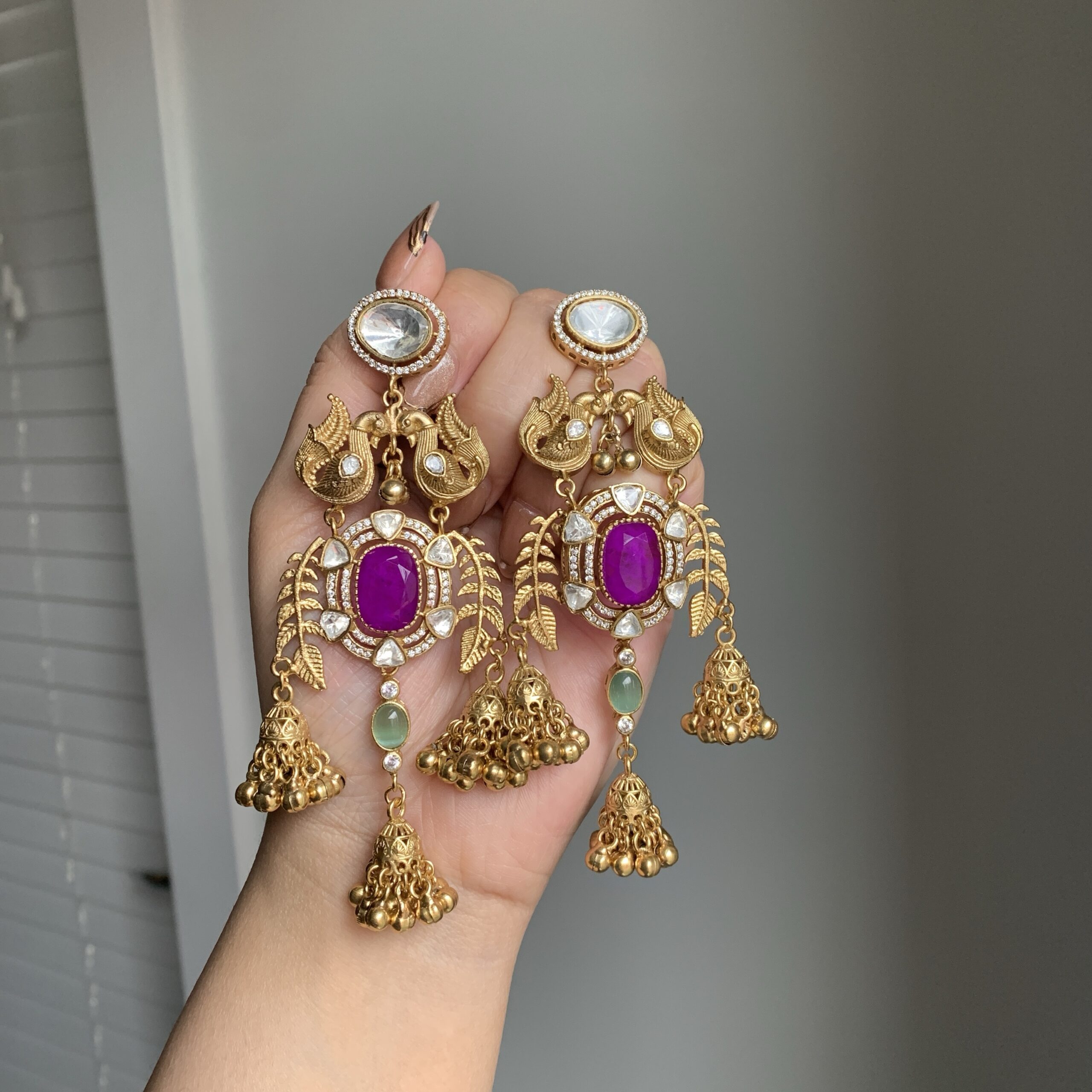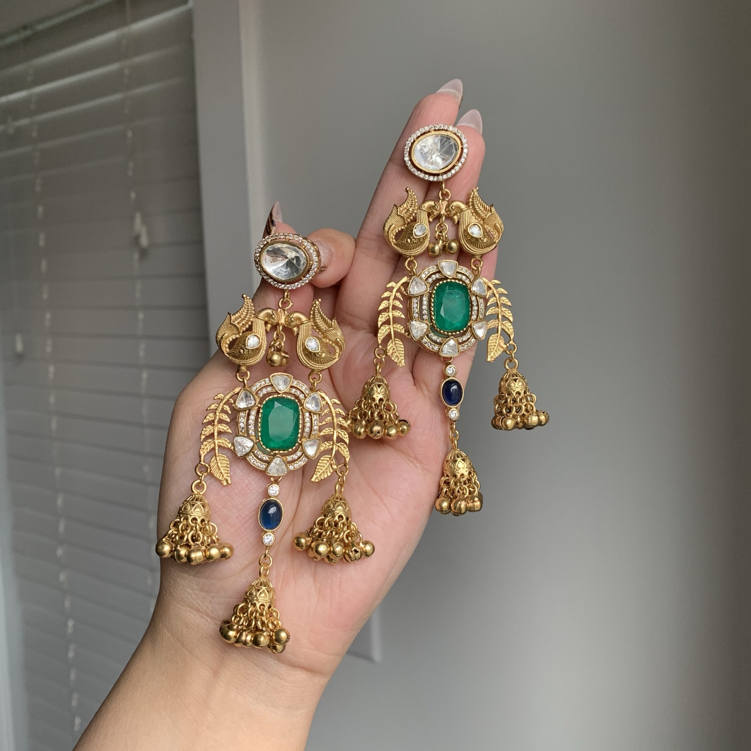 Statement earrings crafted in an antique gold finish, featuring a bold central stone framed by delicate detailing and finished with cascading jhumka drops. Designed to move beautifully, they bring a regal touch to bridal and festive looks.