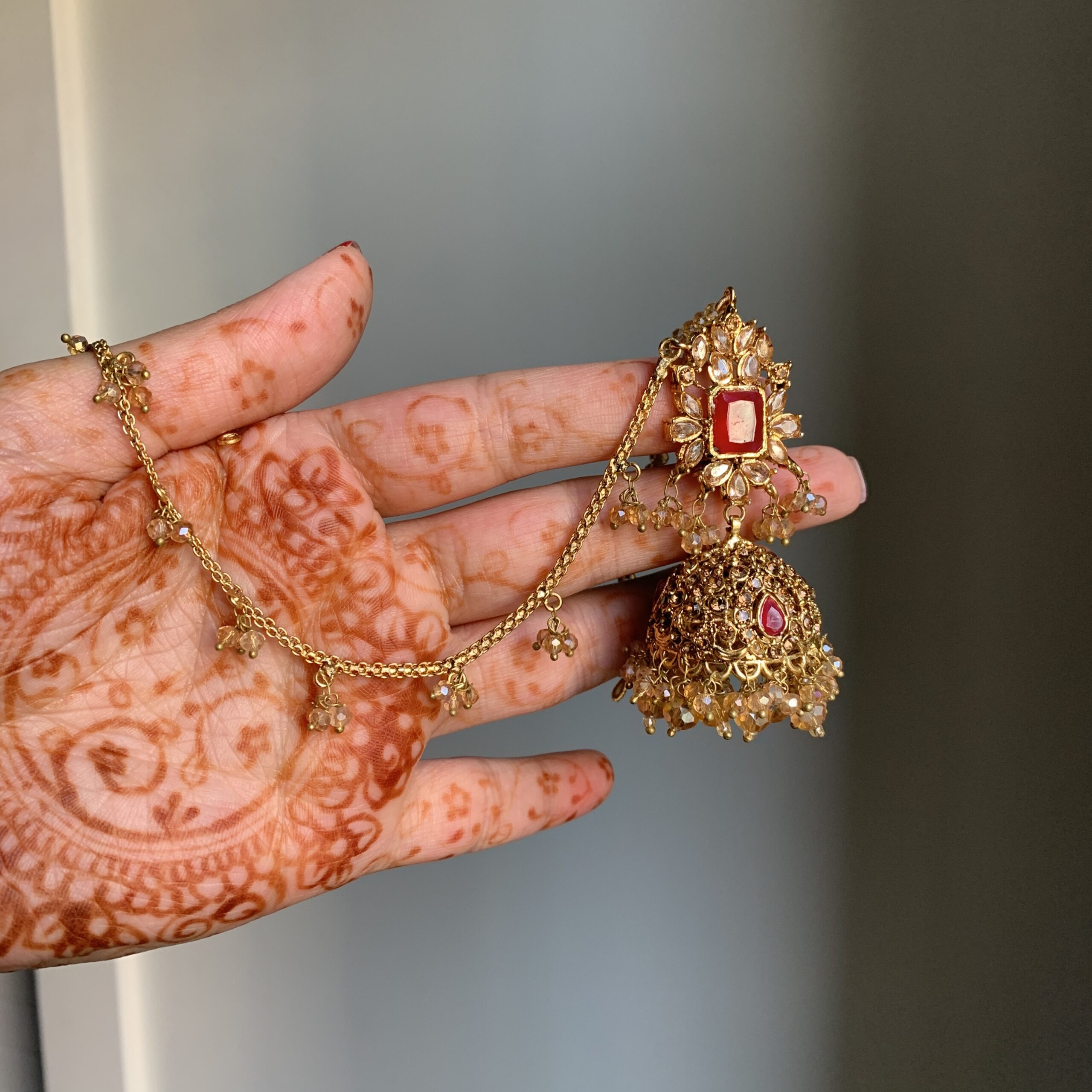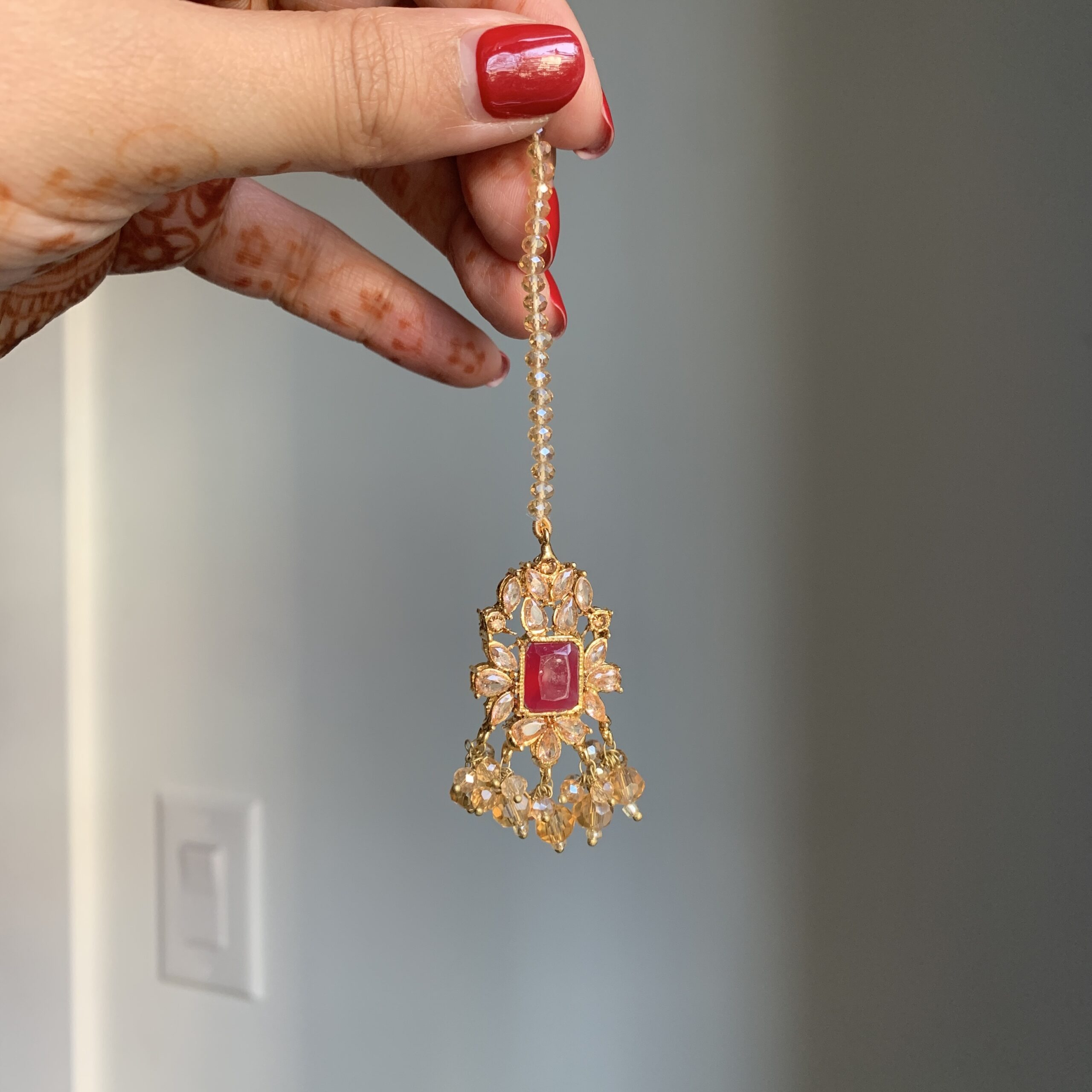 Make a statement with this stunning Pakistani jewelry set, featuring radiant red ruby stones and shimmering champagne crystals, set on champagne base stones with 22k gold plating. This exquisite set includes matching earrings, and tikka; adding a touch of opulence and elegance to any occasion or celebration.
