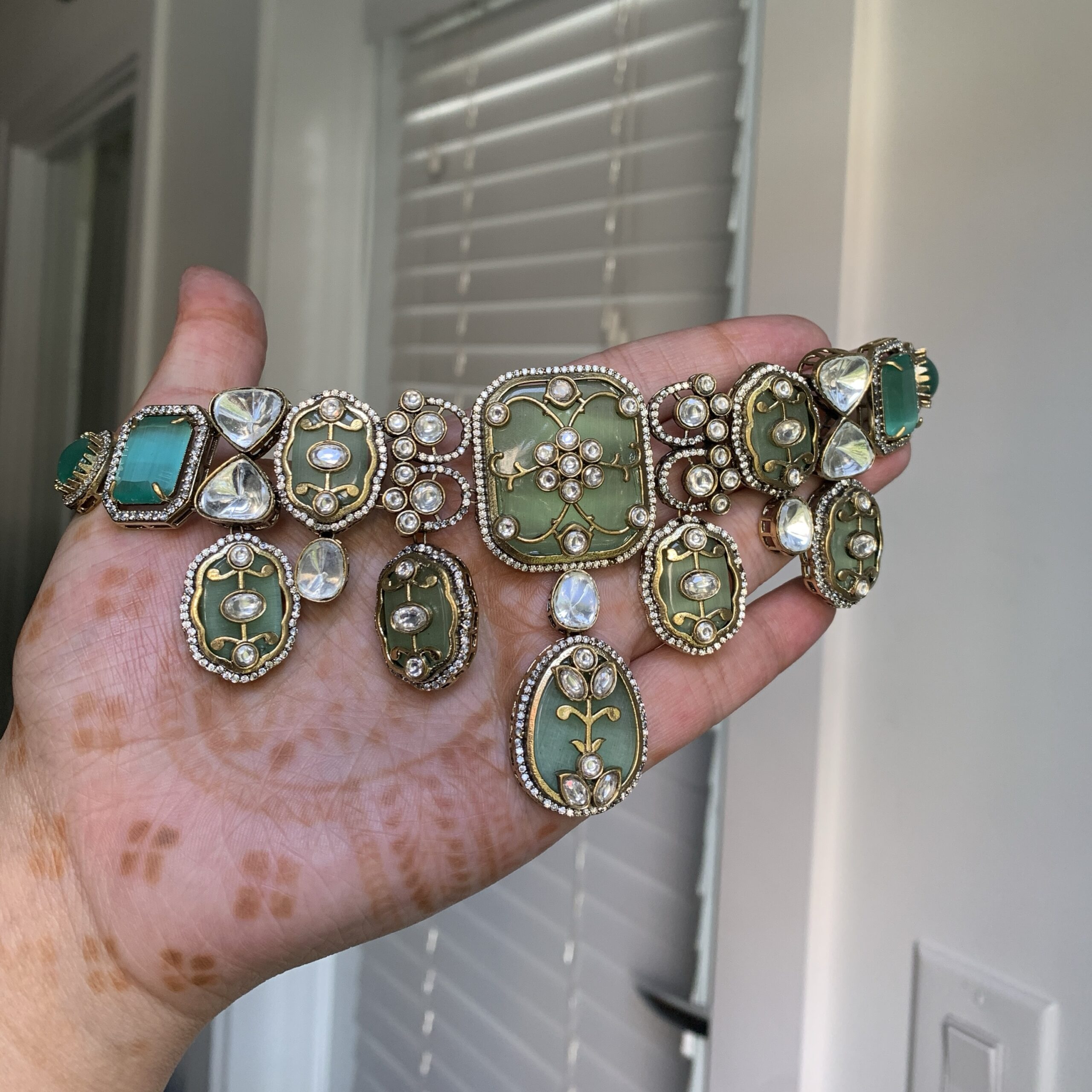 A breathtaking Sabyasachi-style set featuring hand-crafted enamel detailing, luminous kundan, and ornate motifs arranged in a bold, couture structure. The matching earrings mirror the same artistry for a perfectly coordinated, heirloom-worthy look.