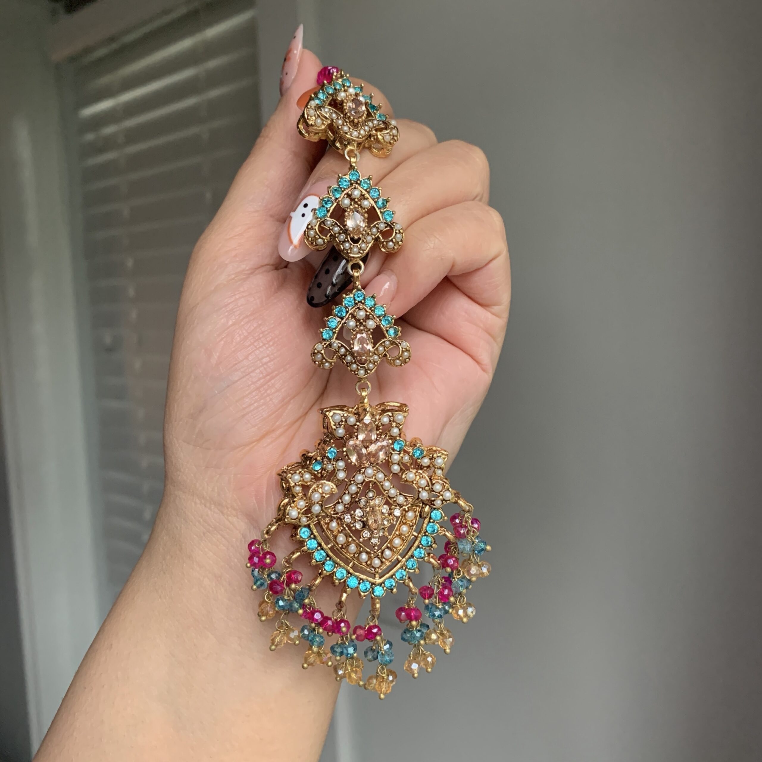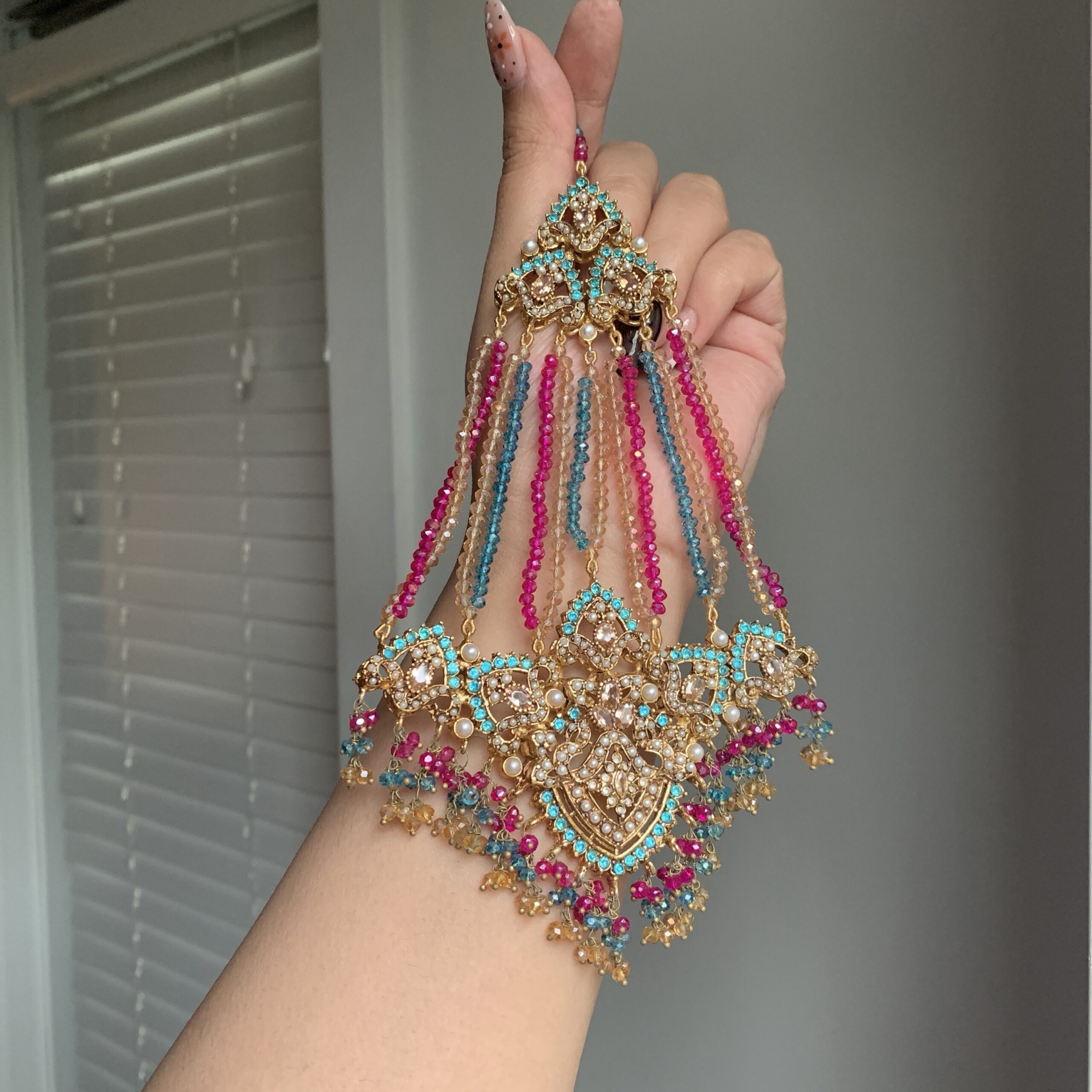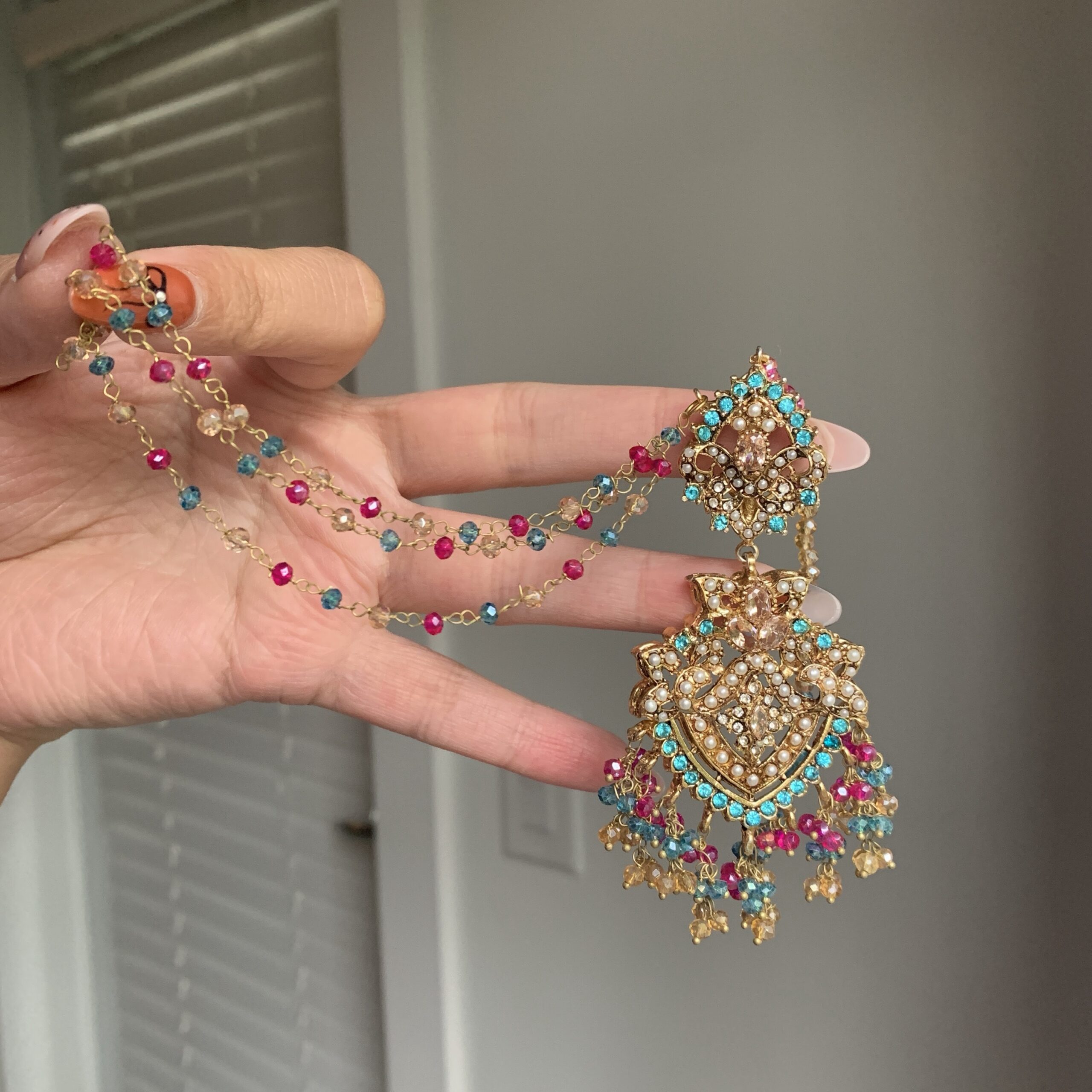 An exquisitely detailed jewelry set featuring a necklace adorned with ornate, lace-like metalwork and shimmering multicolored crystals. The matching earrings, maang tikka, and jhoomar (passa) mirror this intricate craftsmanship, all beautifully finished with a lush, layered fringe of cascading jewel-toned beads.