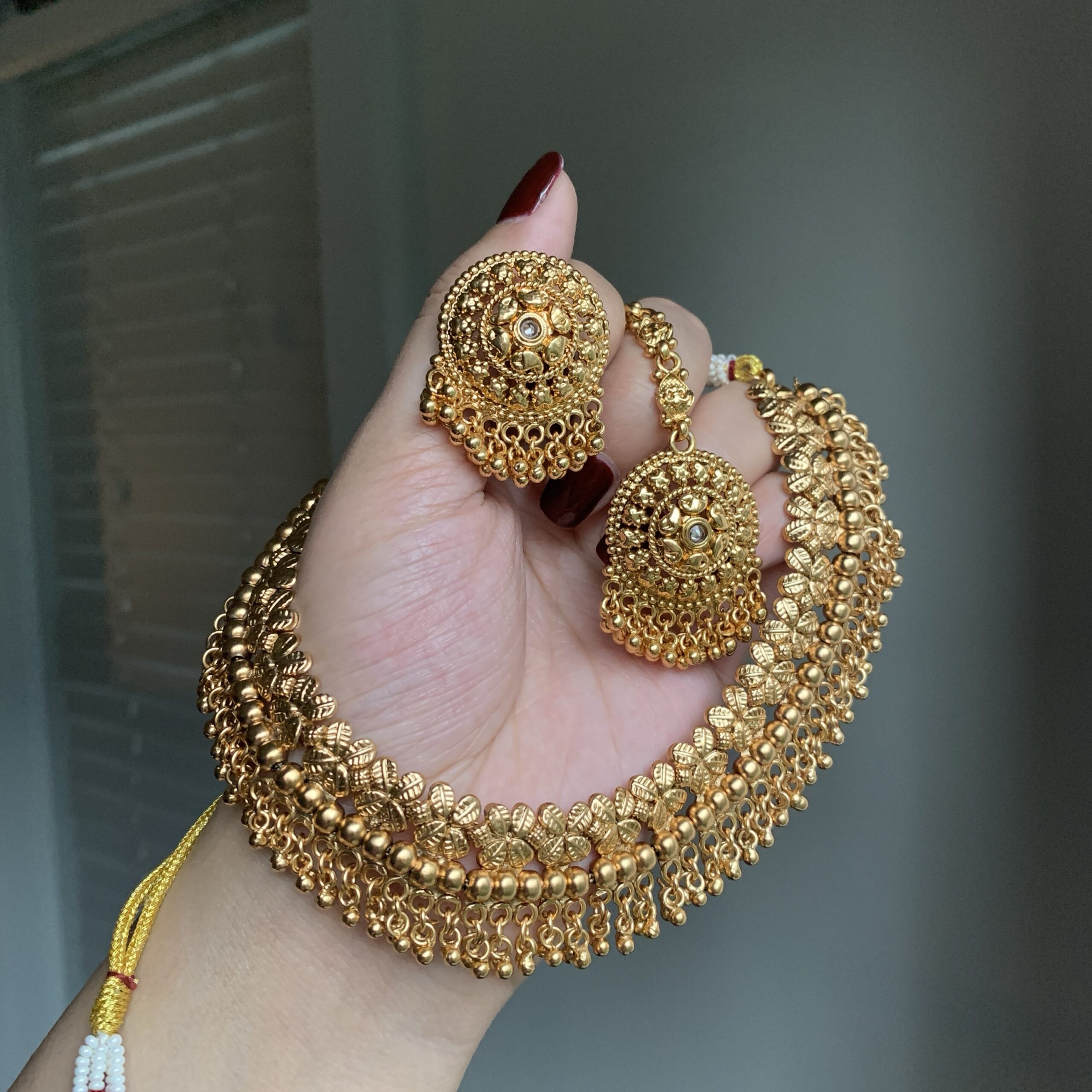 Intricately designed in antique gold, this set combines delicate motifs with cascading bead fringes. The jhumka earrings mirror the same artistry, offering a harmonious and elegant statement piece.