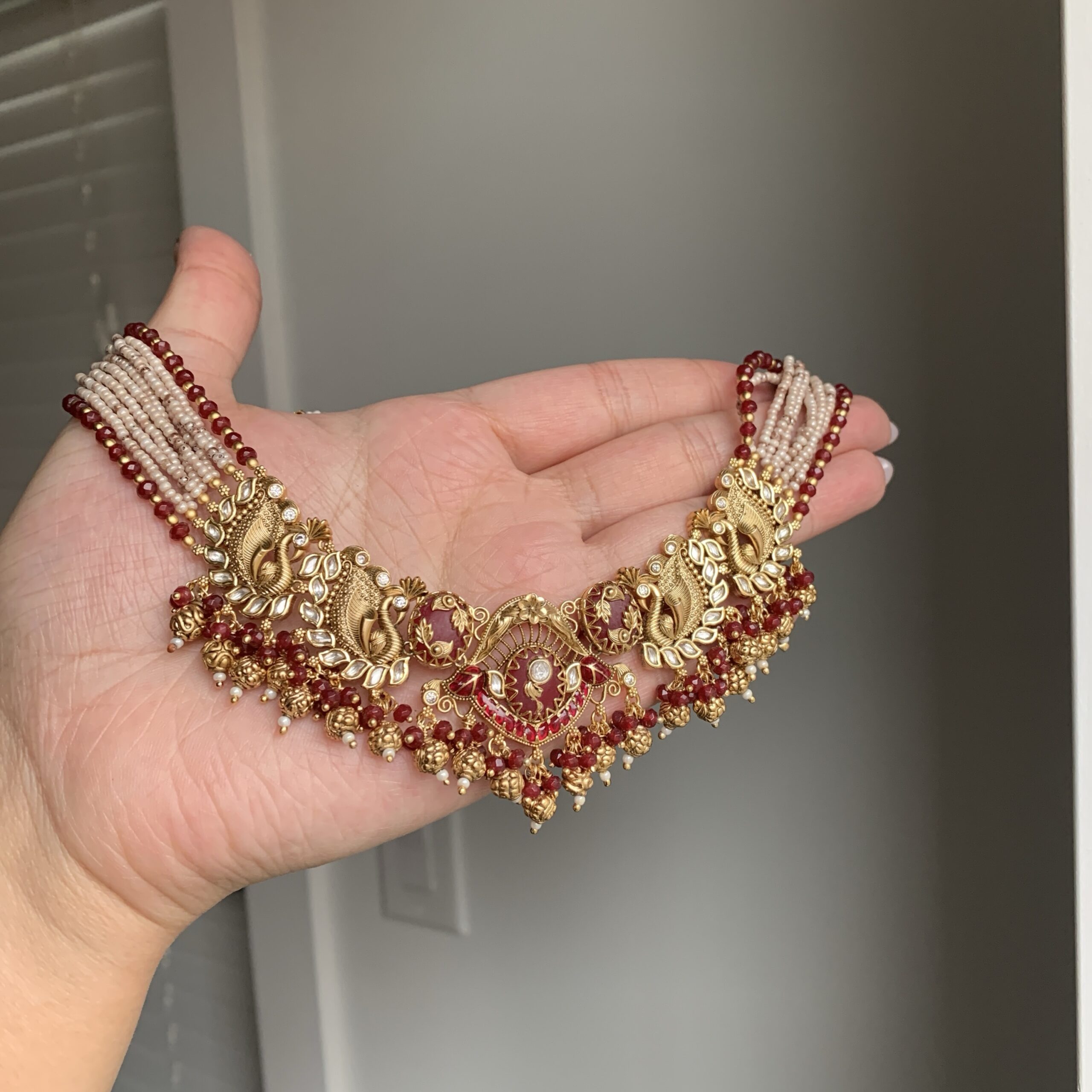 An intricately crafted heritage choker set adorned with sculpted gold detailing, kundan accents, and layered bead strands that frame the neckline with timeless elegance. Finished with delicate ghungroo drops, this piece blends regal tradition with graceful movement for a statement bridal look. Paired with matching earrings.