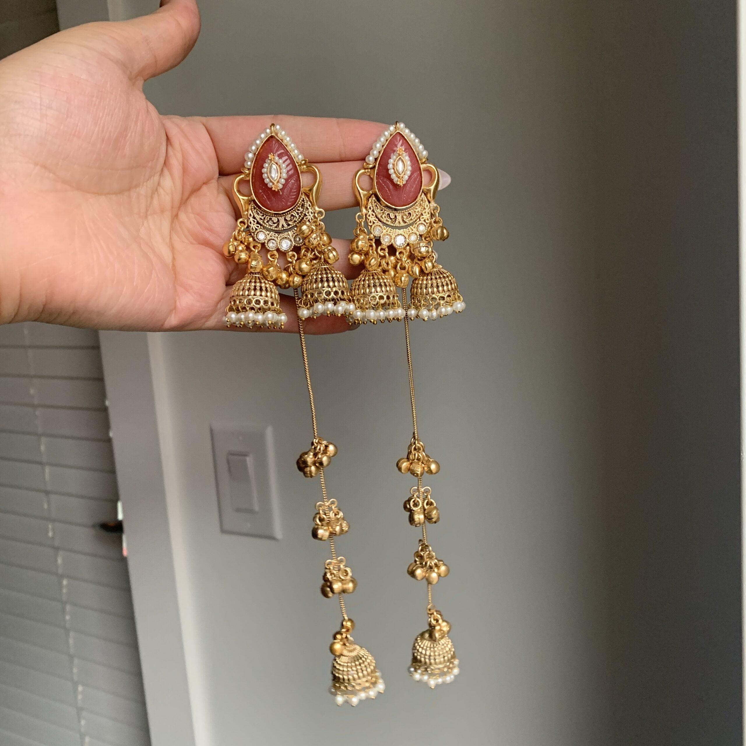 These antique gold–finished long earrings feature an ornate teardrop stud with intricate detailing, paired with layered jhumka drops and cascading ghungroo accents. Elongated chain elements add fluid movement and a rich traditional silhouette. Perfect for festive occasions, weddings, and elevating ethnic or fusion ensembles.