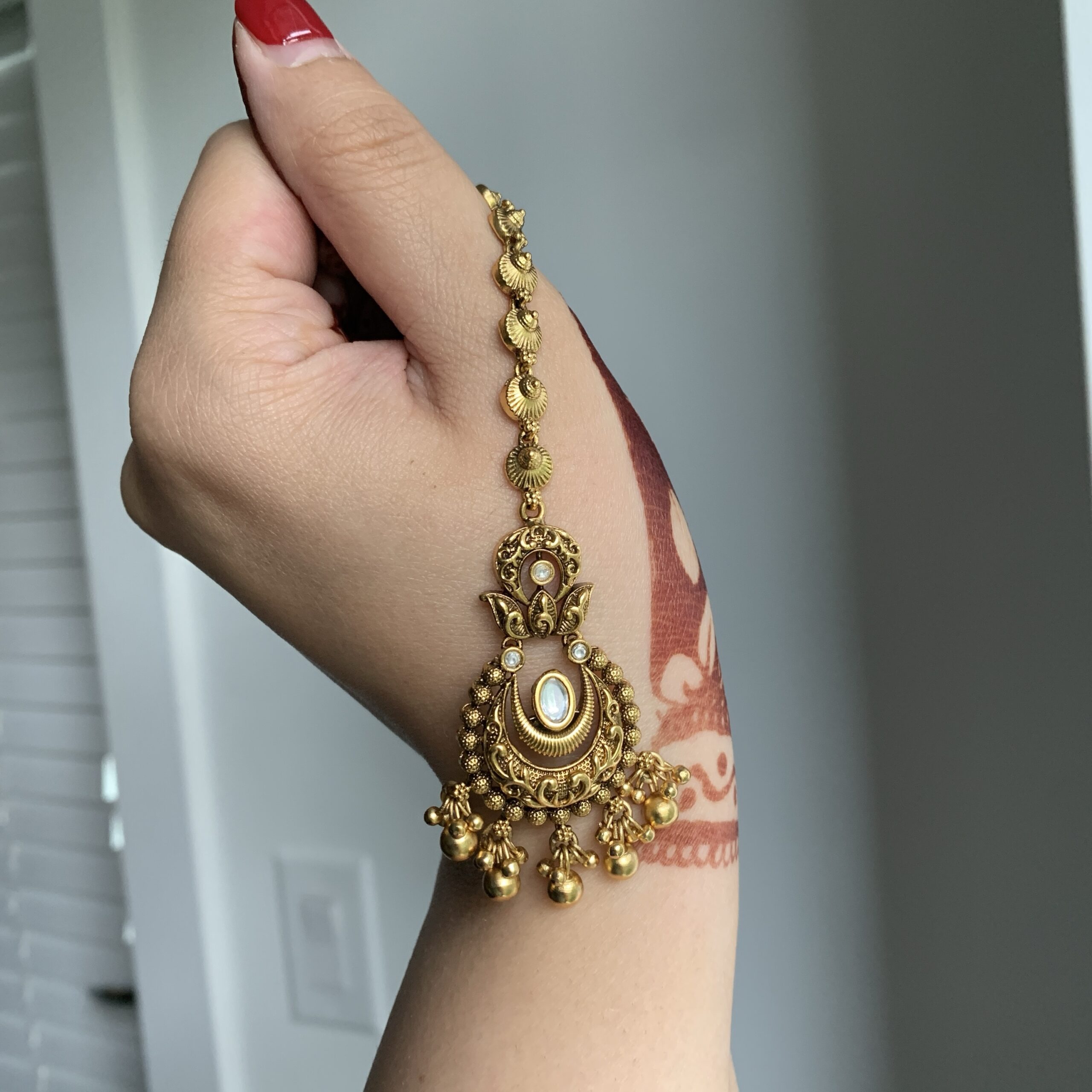 A beautiful fusion of tradition and grandeur, this antique gold necklace set exudes royal charm. The exquisite necklace features delicate gold work and charming pendant drops, paired with coordinating earrings and a tikka. Perfect for any celebration, this set elevates your look with its opulent design and timeless sophistication.