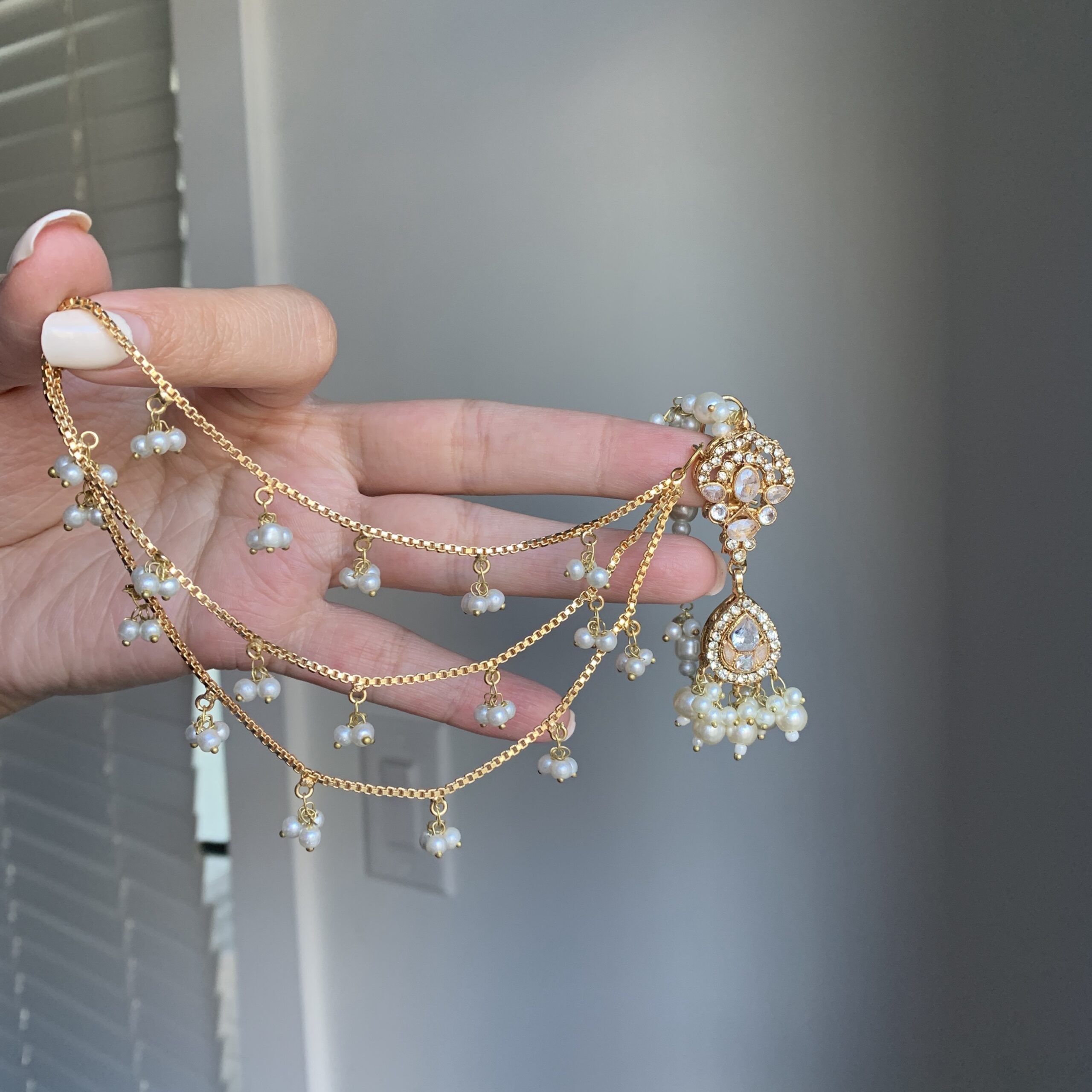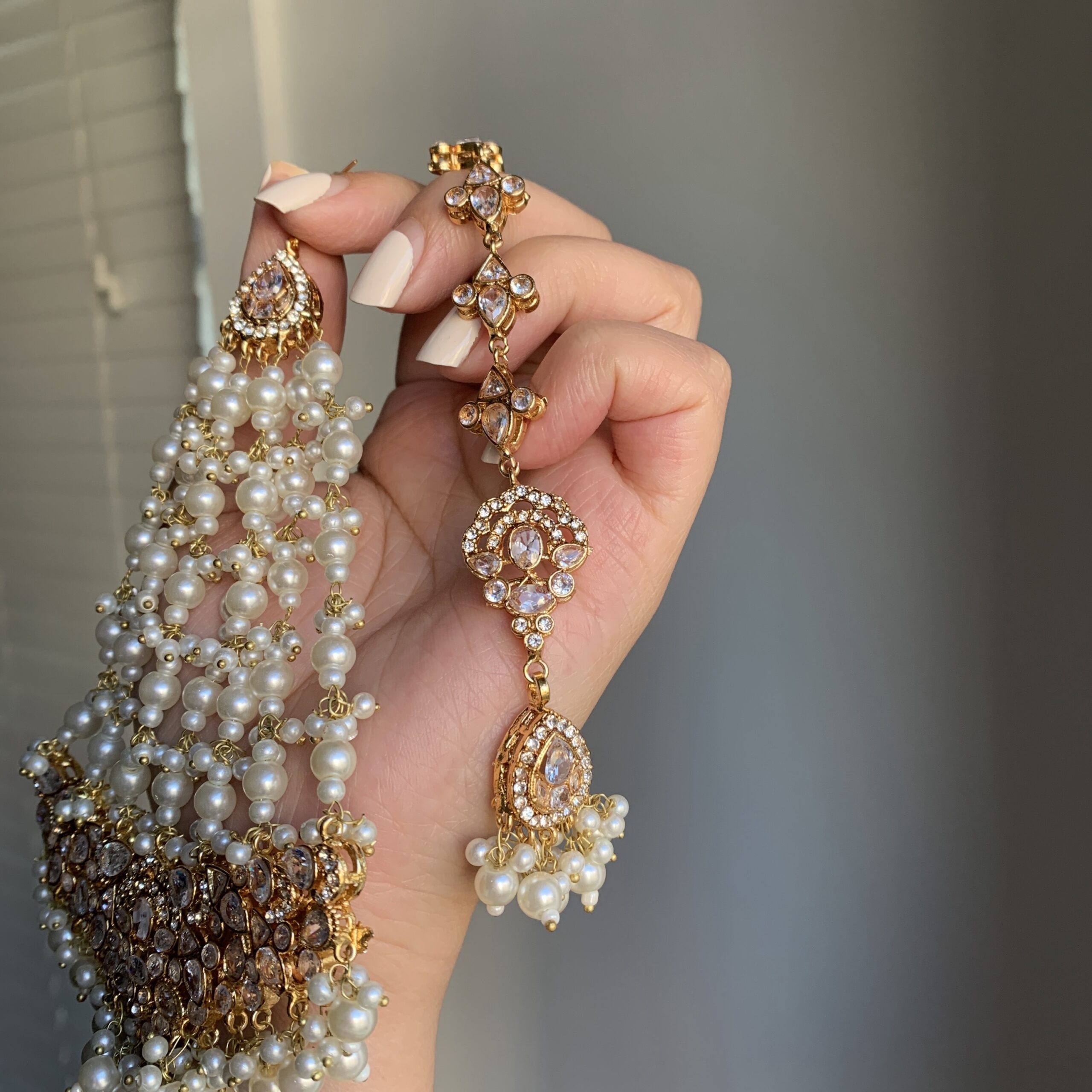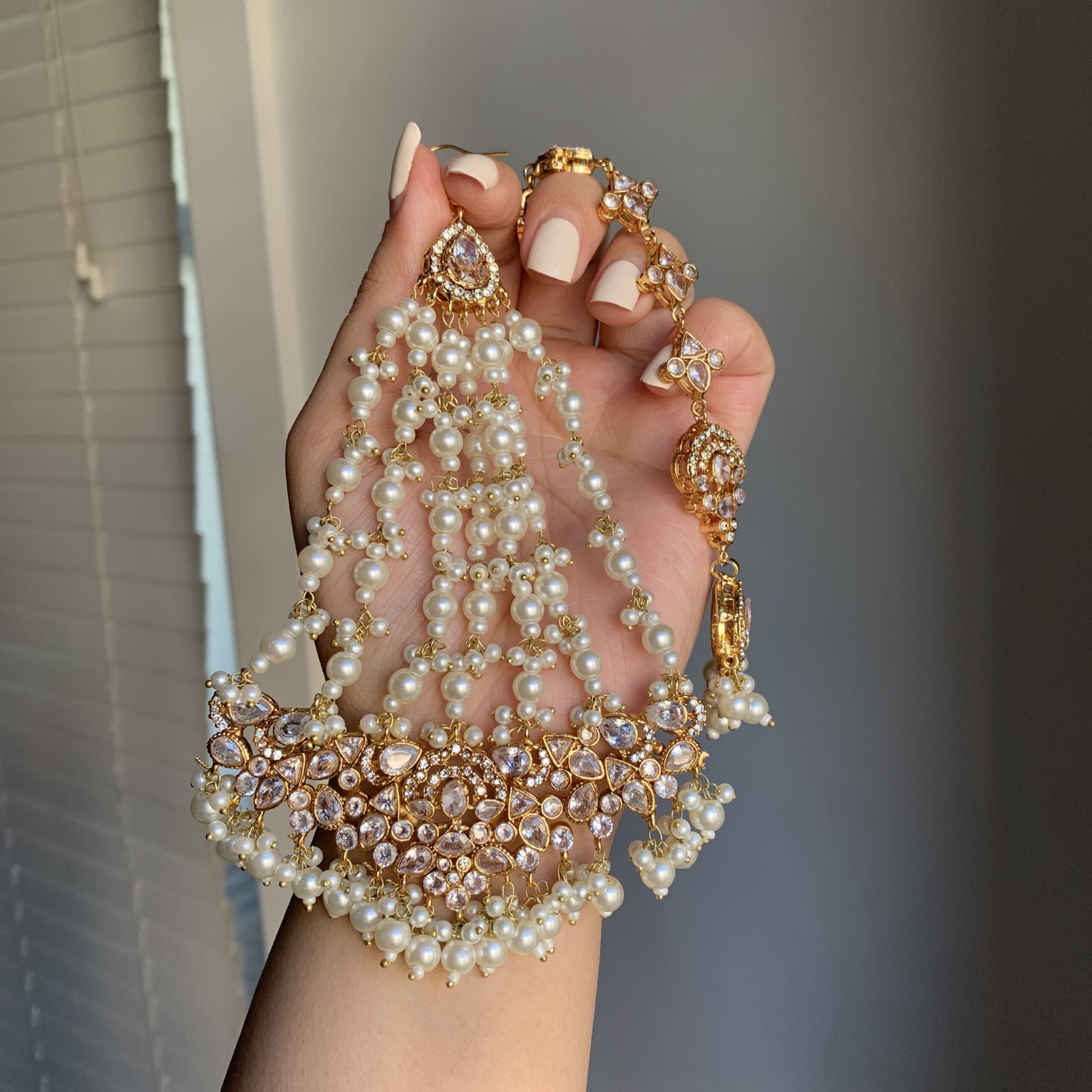 A harmonious blend of intricate gold-toned detailing, shimmering stones, and delicate pearl cascades defines this elegant set. Designed with matching earrings, a tikka, and a jhoomer, the ensemble captures refined beauty with a soft yet opulent finish.
