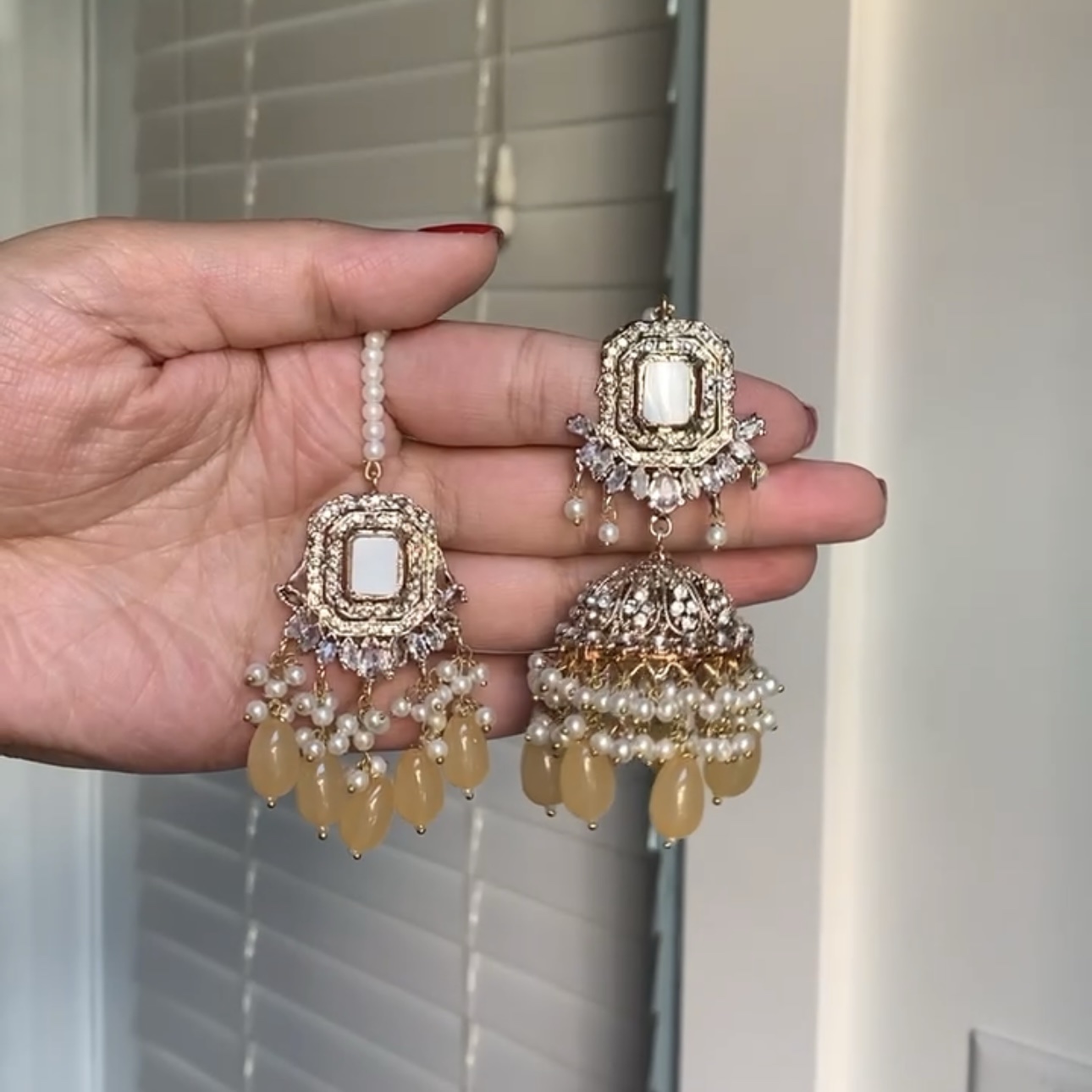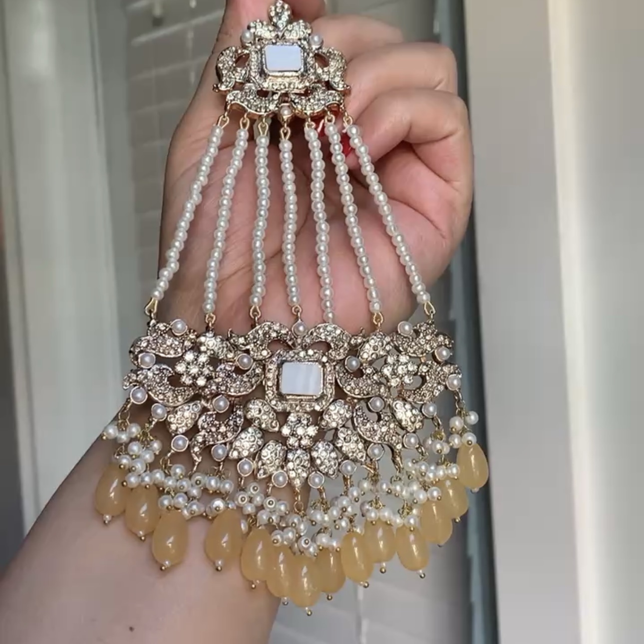 An intricately crafted statement set featuring luminous stones, delicate pearl detailing, and graceful drop accents, designed to sit beautifully along the neckline. Completed with matching earrings that mirror the same refined craftsmanship, this set brings timeless elegance to bridal and formal looks alike.