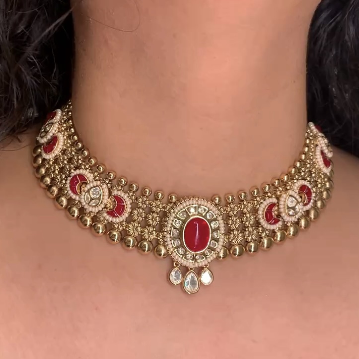 Designed with ornate craftsmanship and a harmonious blend of gold textures and soft sparkle, this set frames the neckline beautifully. The result is a classic, heirloom-inspired piece that adds quiet luxury to any ensemble. Paired with matching earrings.